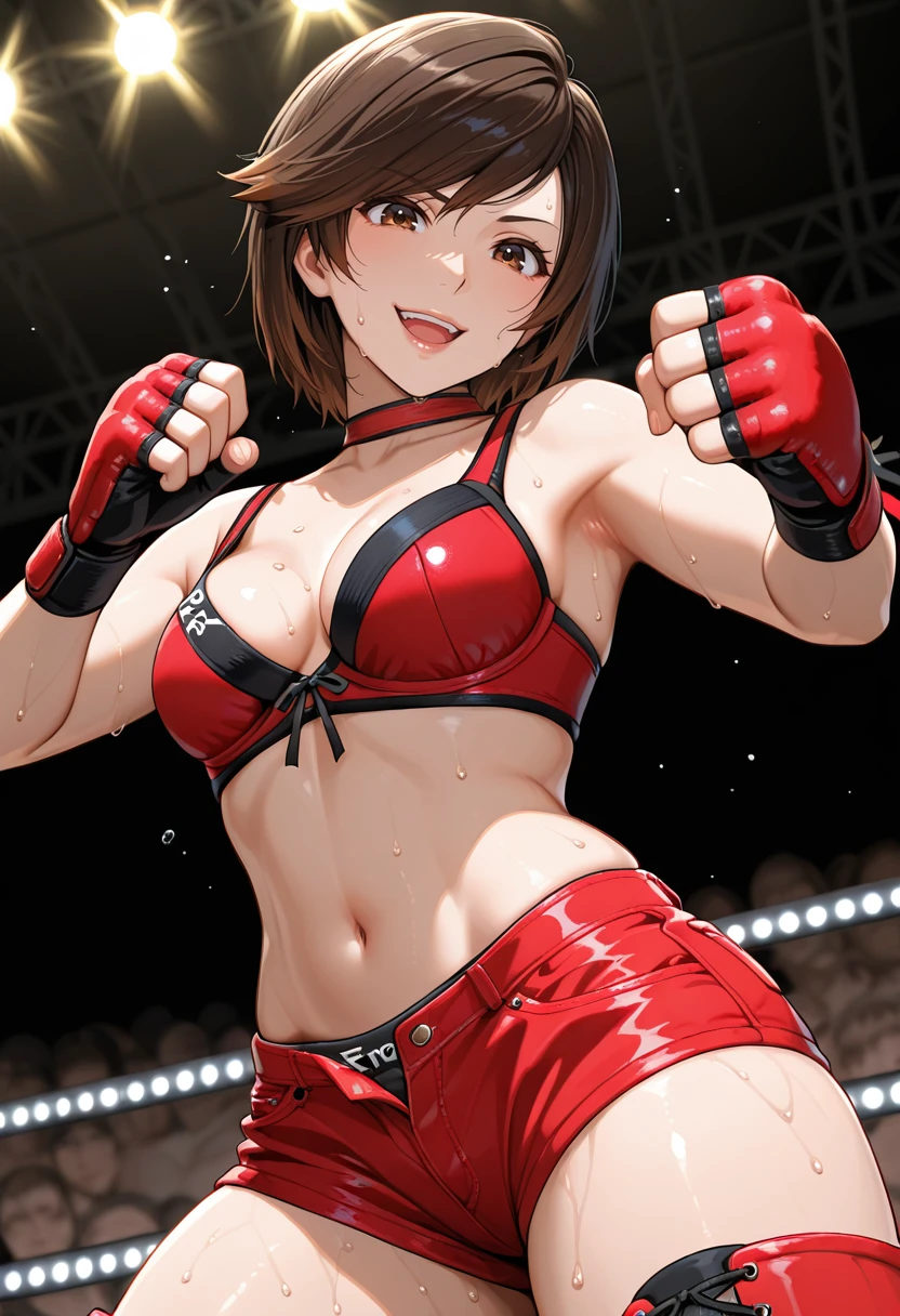 "RE1KH1N, short hair, brown hair, brown eyes, lips, choker, red sports bra, red shorts, open shorts thighboots"
