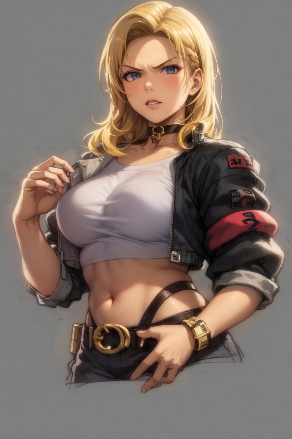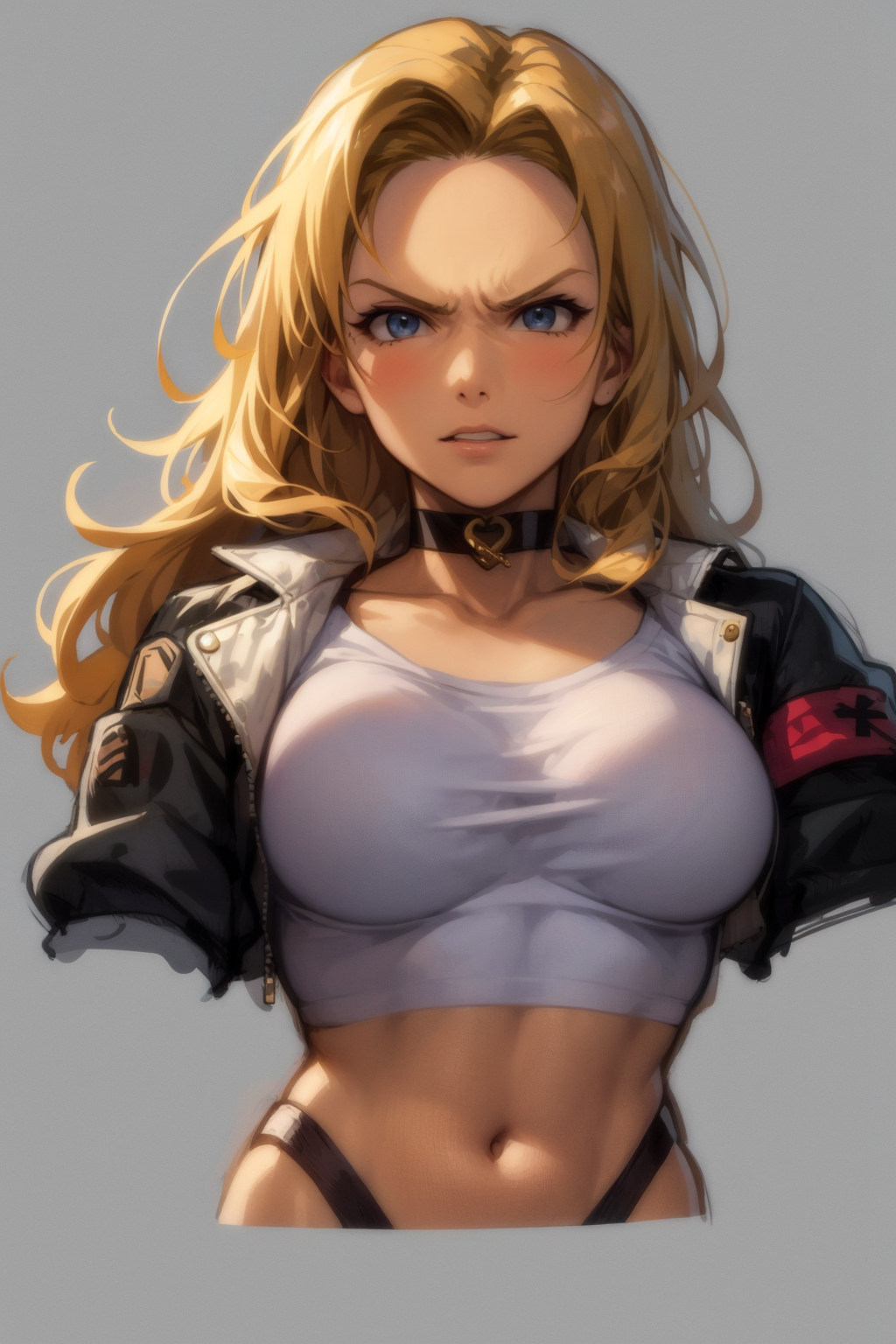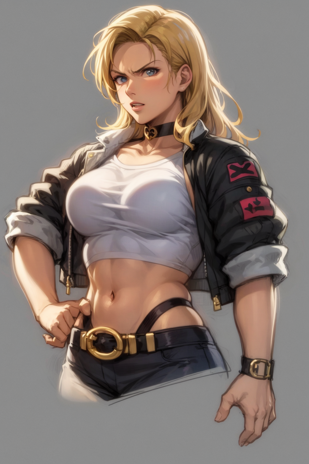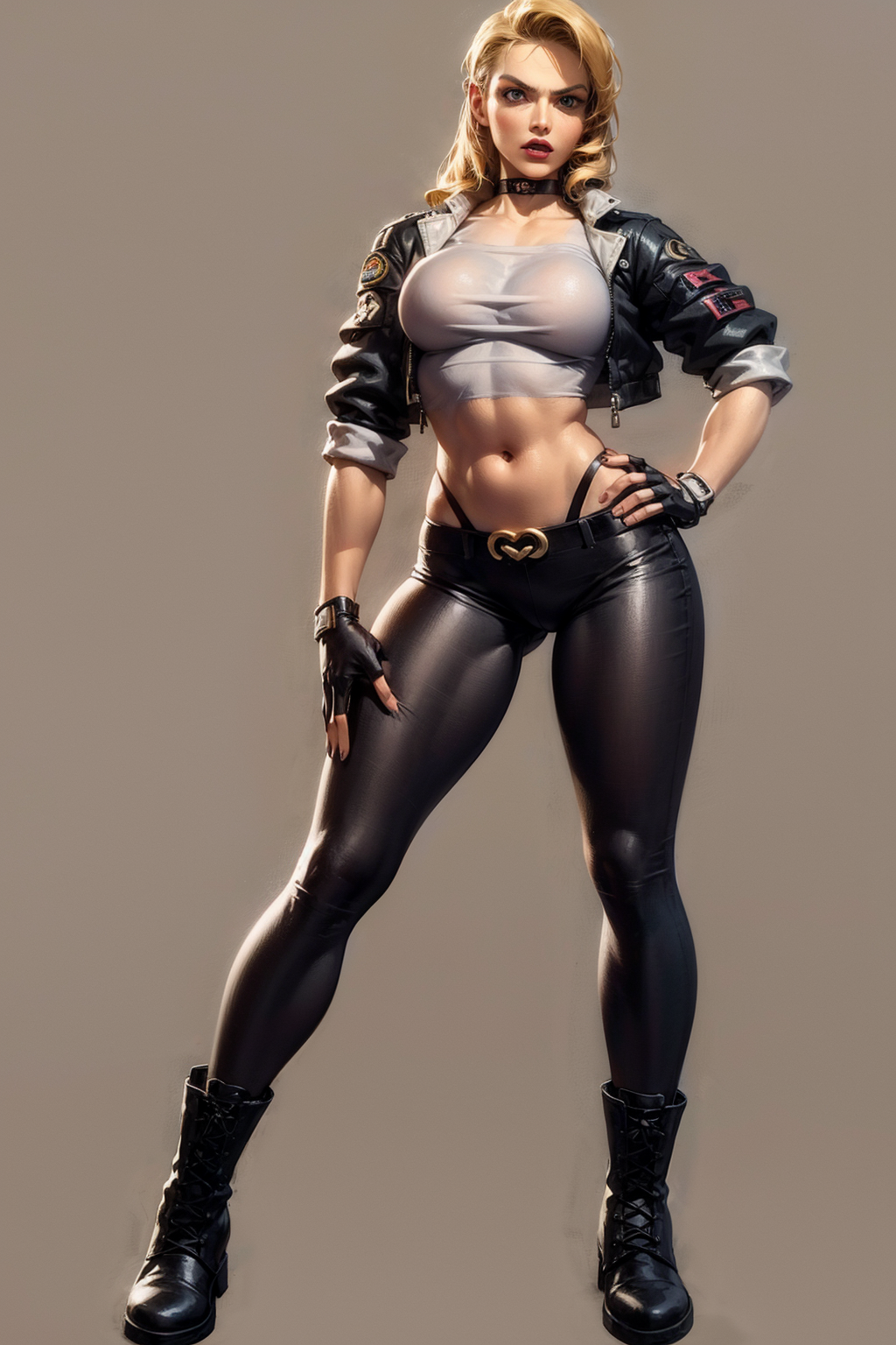 Other prompts : long hair, blonde hair, blue eyes, breasts, choker, crop top, cropped jacket, black fingerless gloves, highleg panties, combat boots, lace-up boots, lipstick, makeup, (abs:0.3), midriff, navel, pants