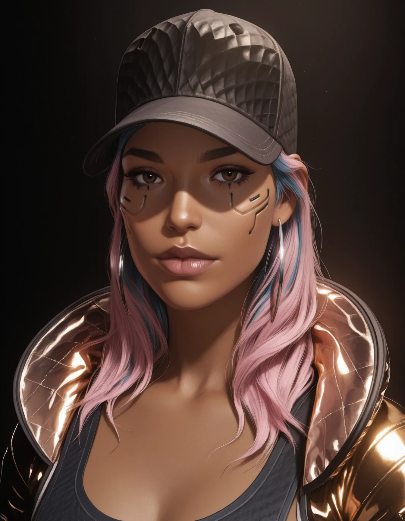 Outfit: baseball cap, hoop earrings, choker, cropped jacket, tank top, midriff, belt, leather pants, shoes, platform footwear, bracer