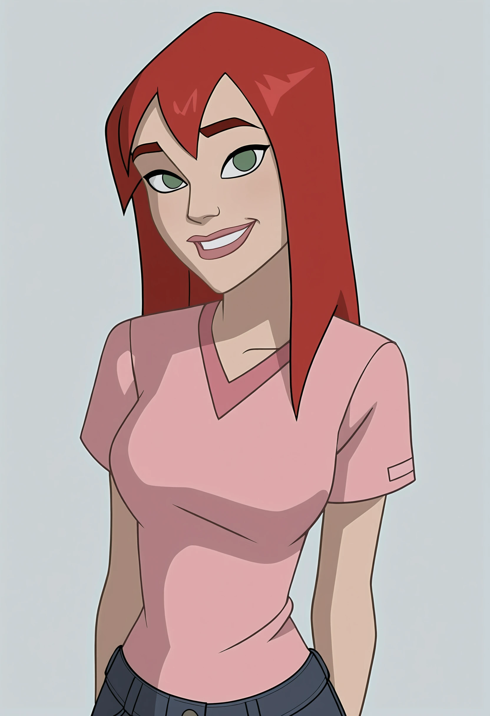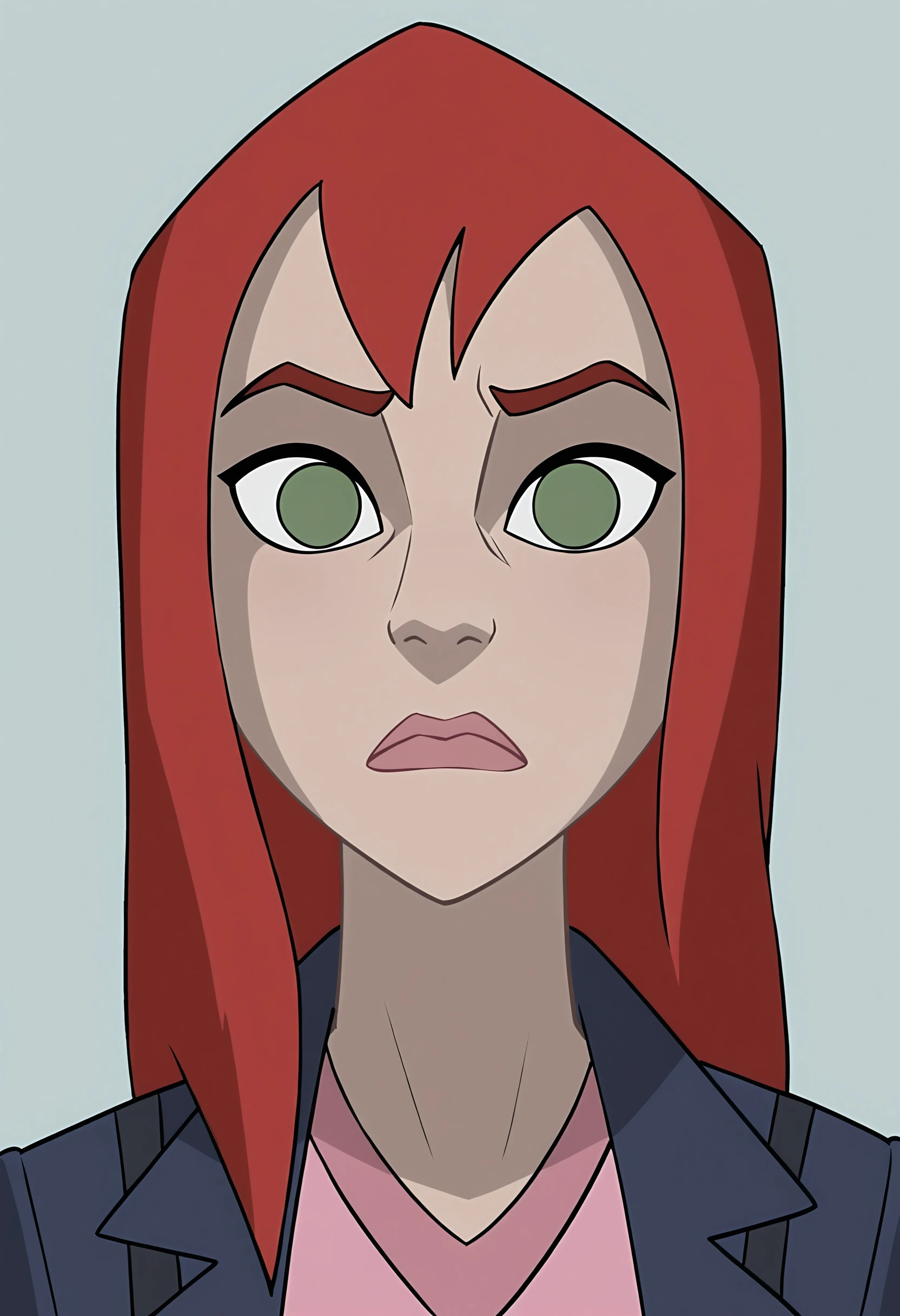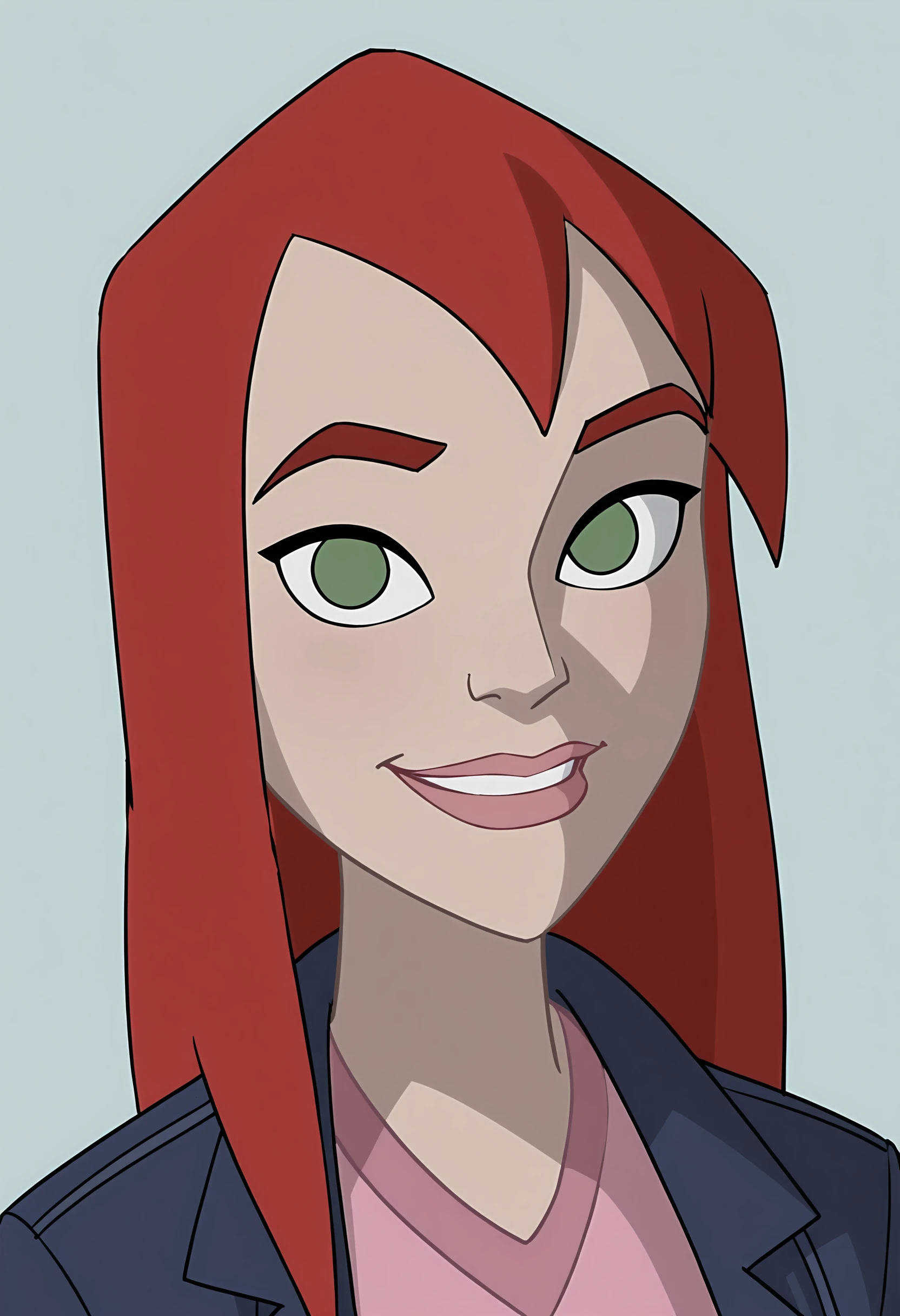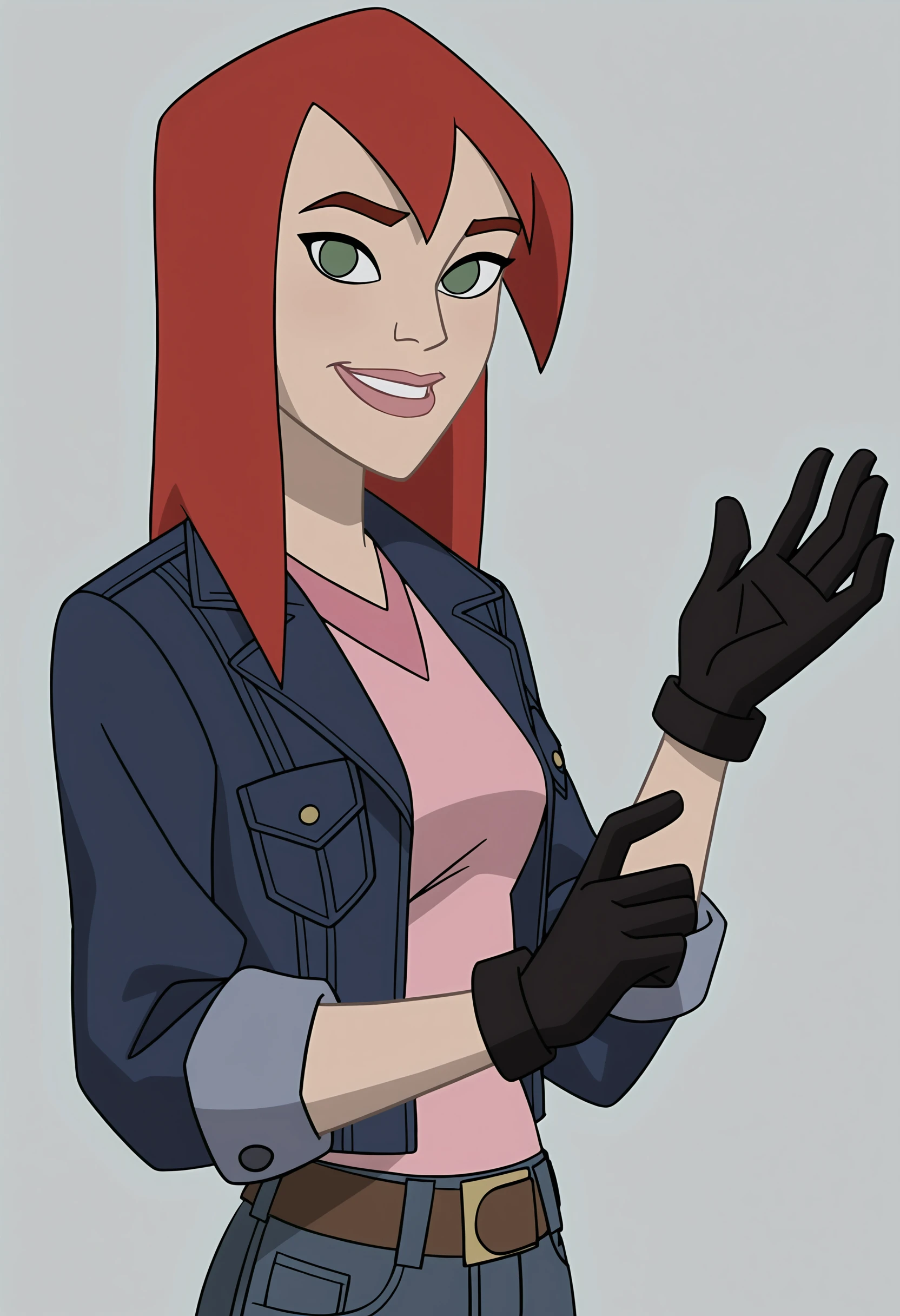 red hair, green eyes, blue jacket, gloves, jeans, pink shirt