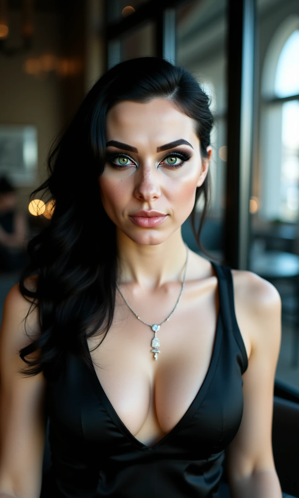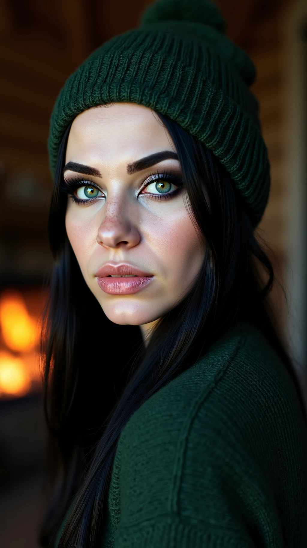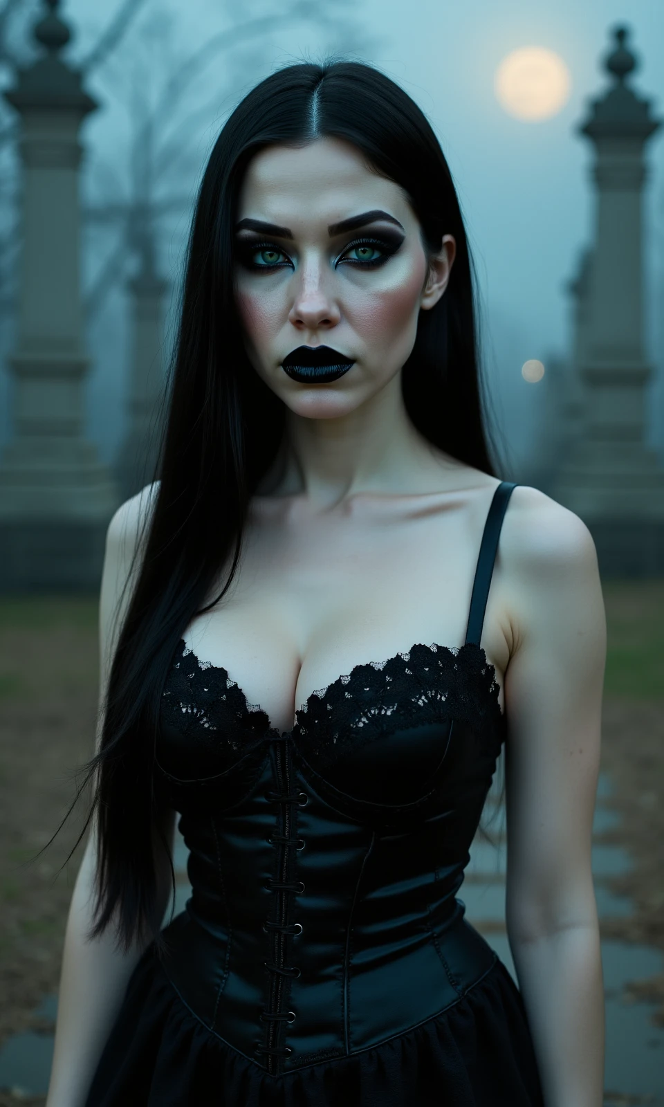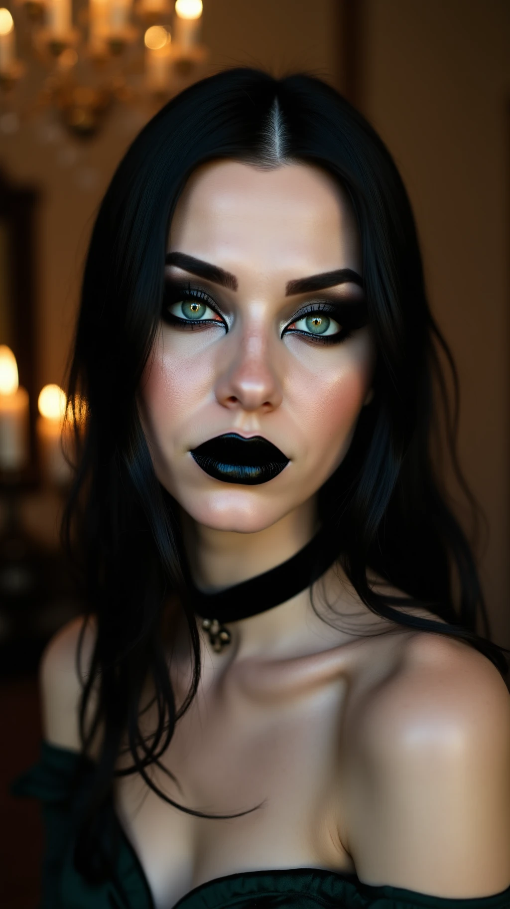 Physical traits:pale skin, fair complexion, light freckles (optional), vivid green almond-shaped eyes, long silky black hair, full lips with black lipstick