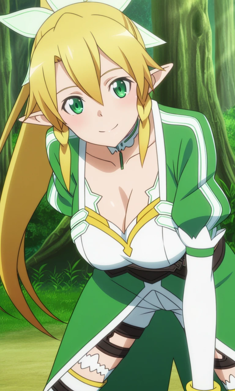 leafa (sao),1girl,solo, long hair, blonde hair, hair between eyes, green eyes, ponytail, braid, pointy ears, twin braids, pointy ears,white thighhighs,green dress, white shorts, white sleeves,
