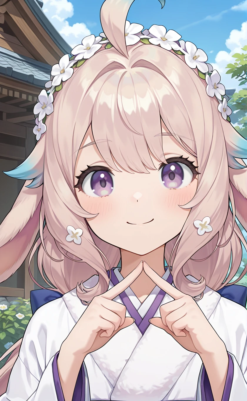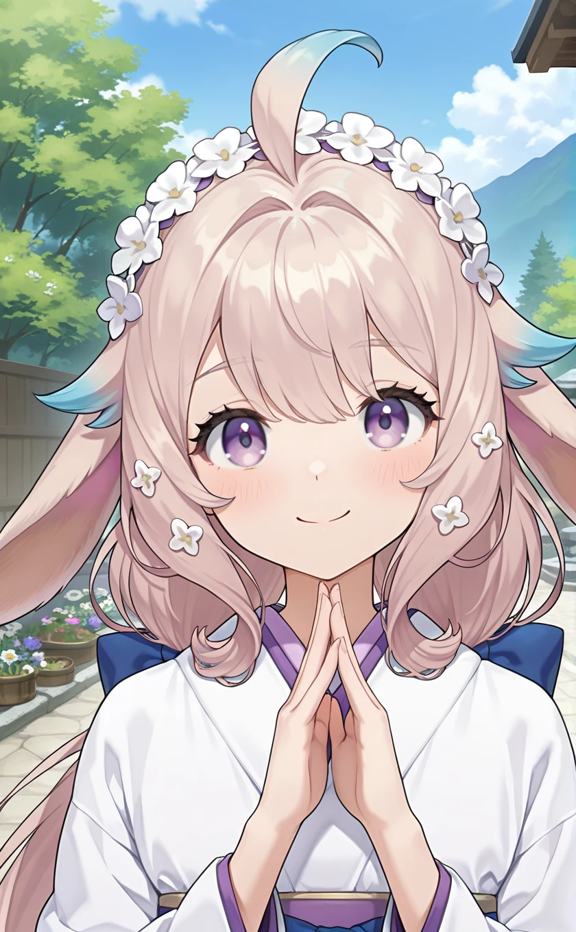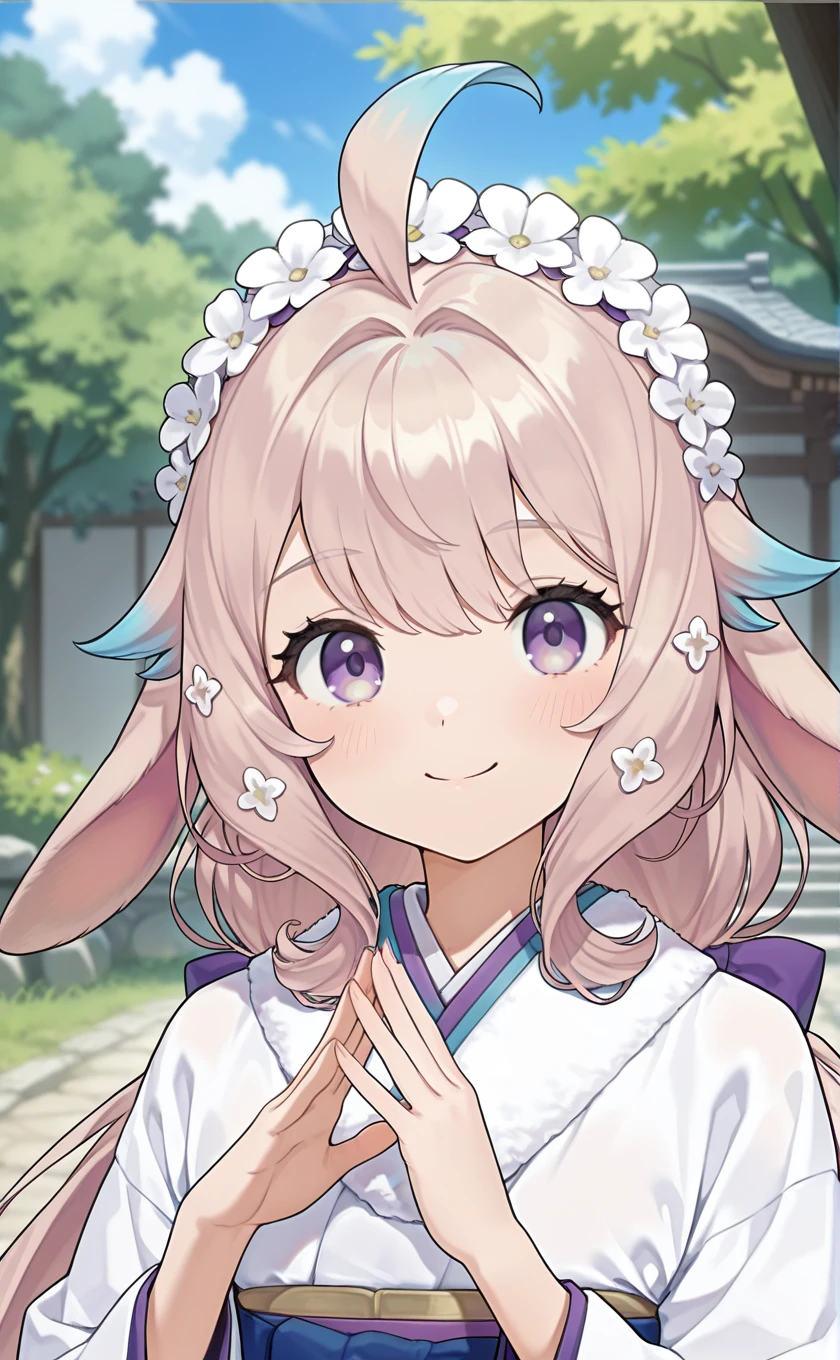 ahoge,lop rabbit ears,flower hairband,white flower,very long hair,blonde hair,gradient hair,low twintails,hair ornament,hair back bow,purple eyes