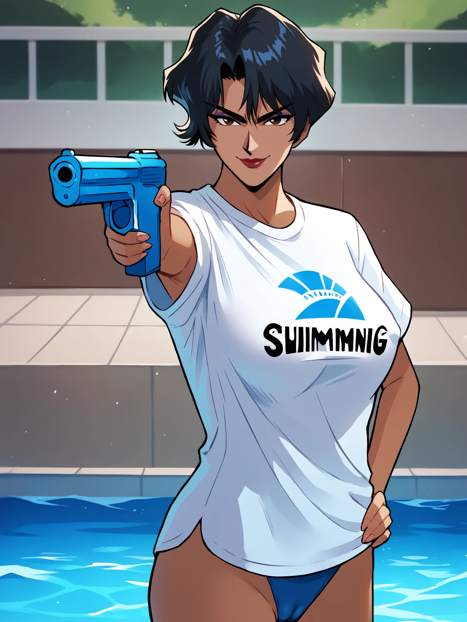 white shirt, t-shirt, print shirt, swimsuit under clothes