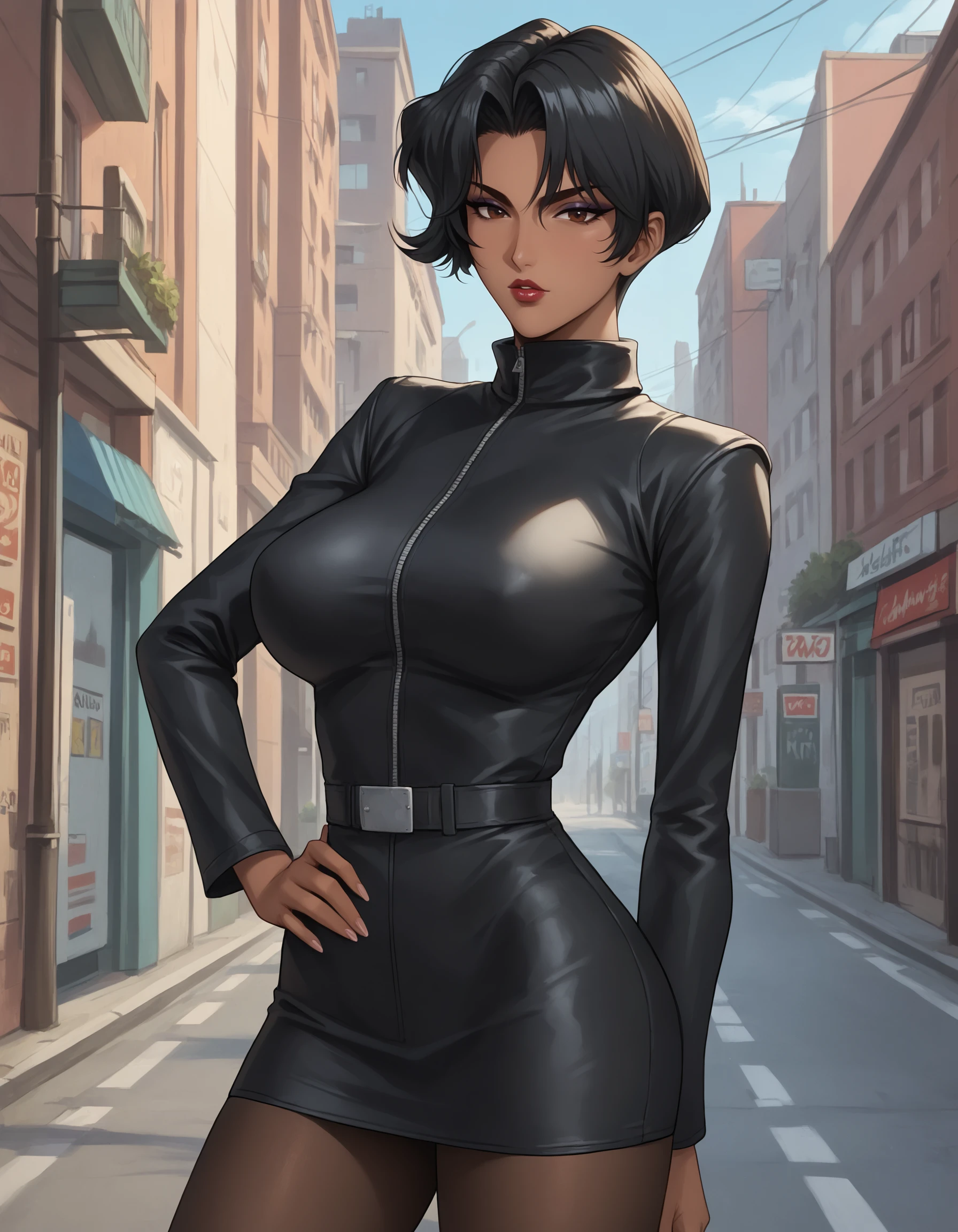 black hair, short hair, brown eyes, makeup, lips, lipstick