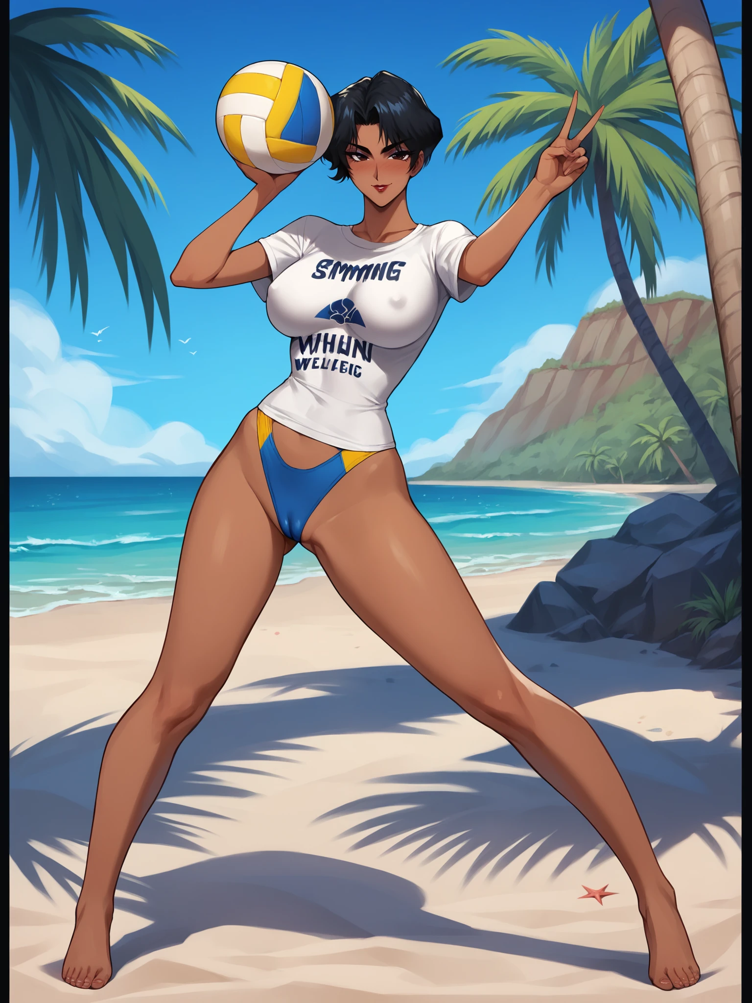 White shirt, t-shirt, swimsuit under clothes, barefoot,