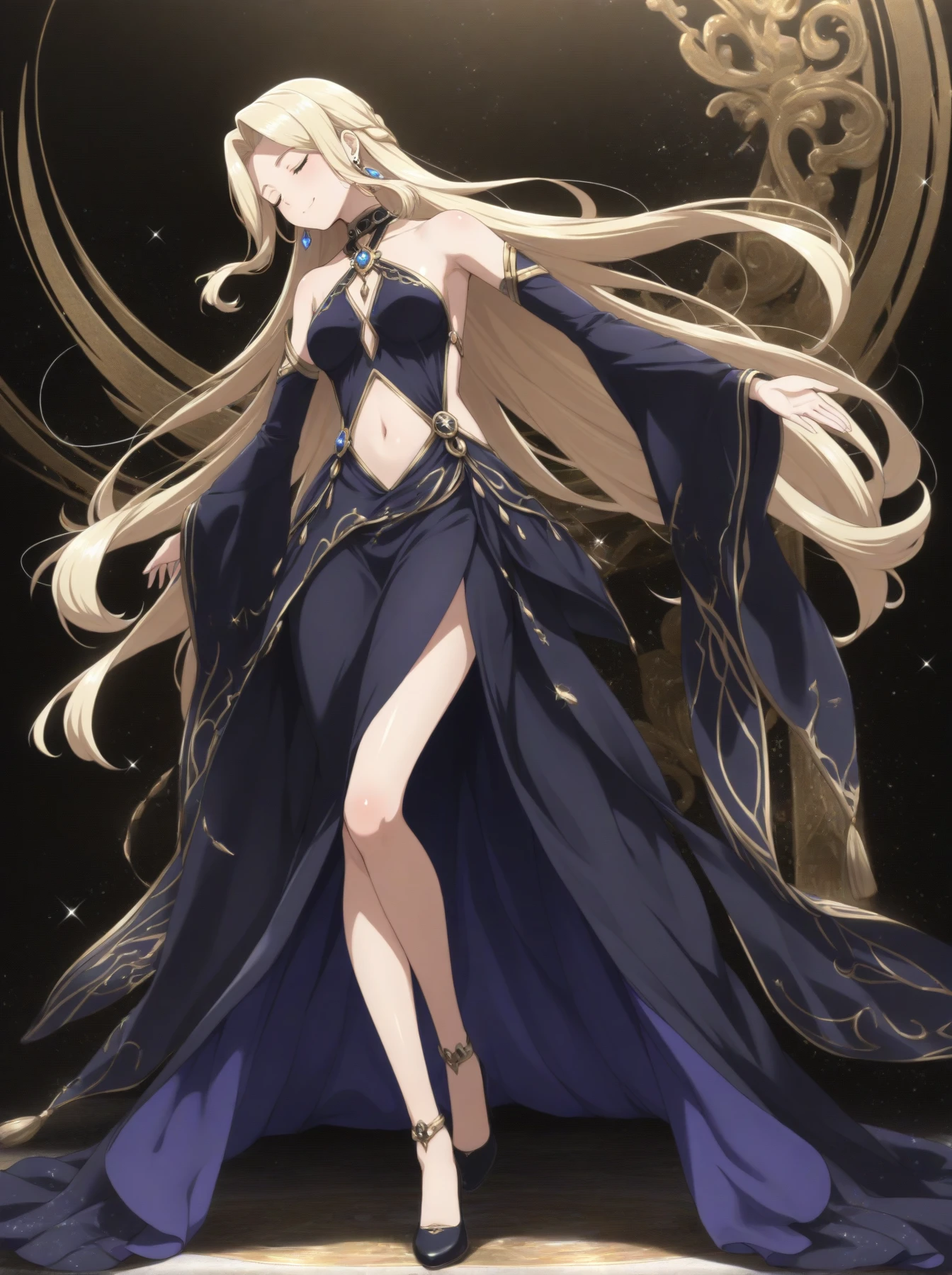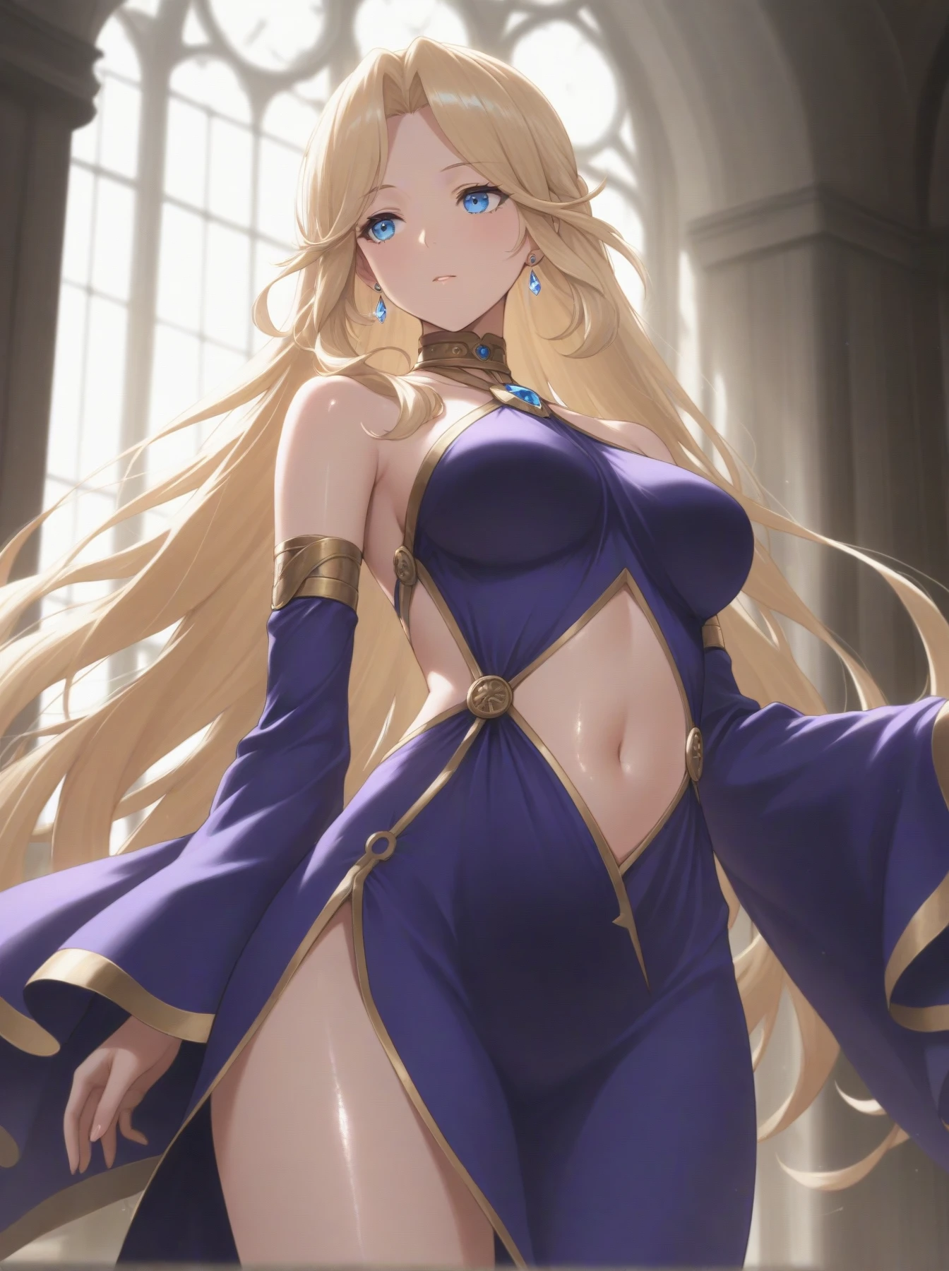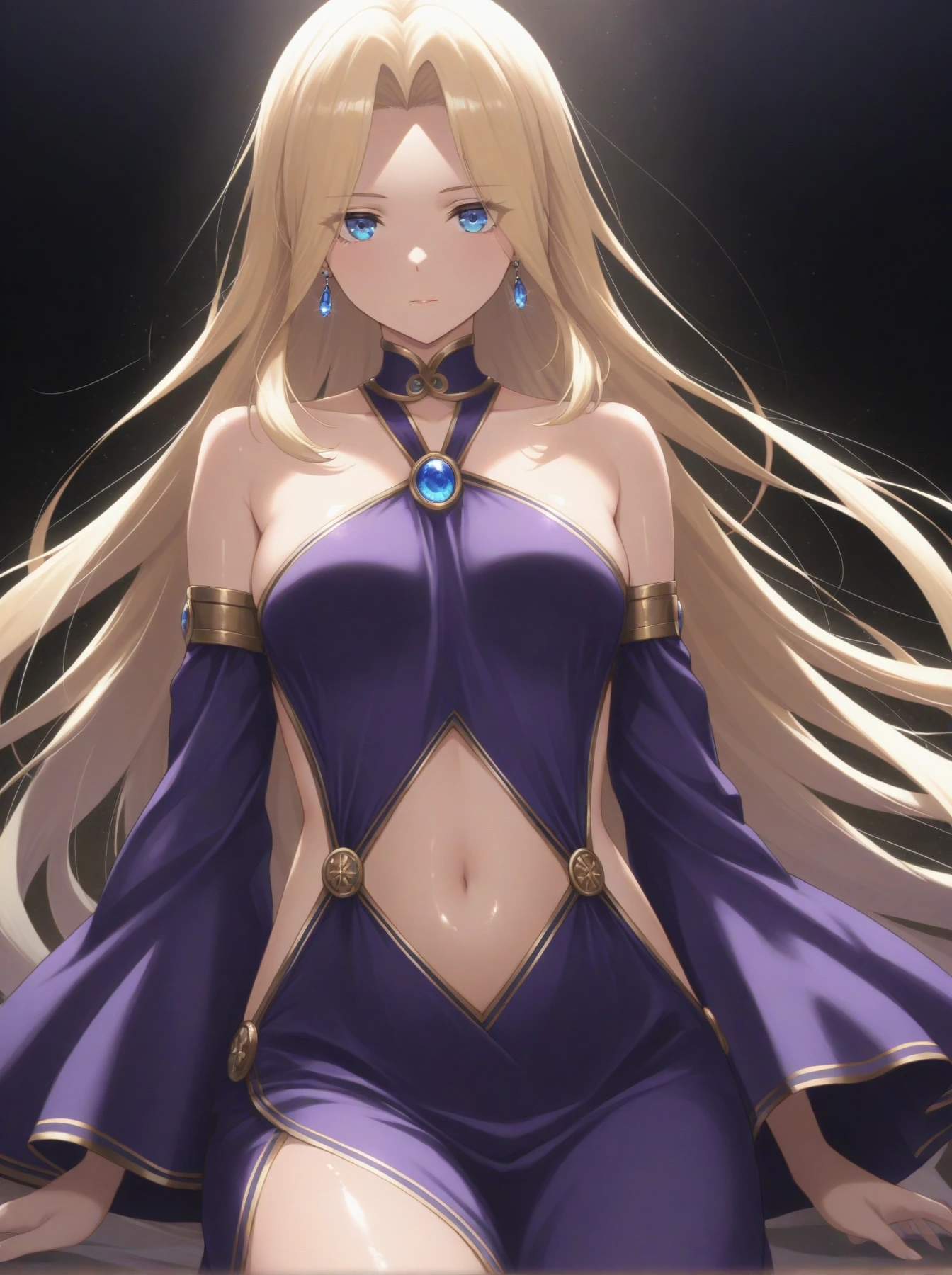 Clothes: (earrings, purple backless dress, gold trim, long dress, bare shoulders, detached sleeves, wide sleeves, navel cutout, slit dress, dress shoes)
