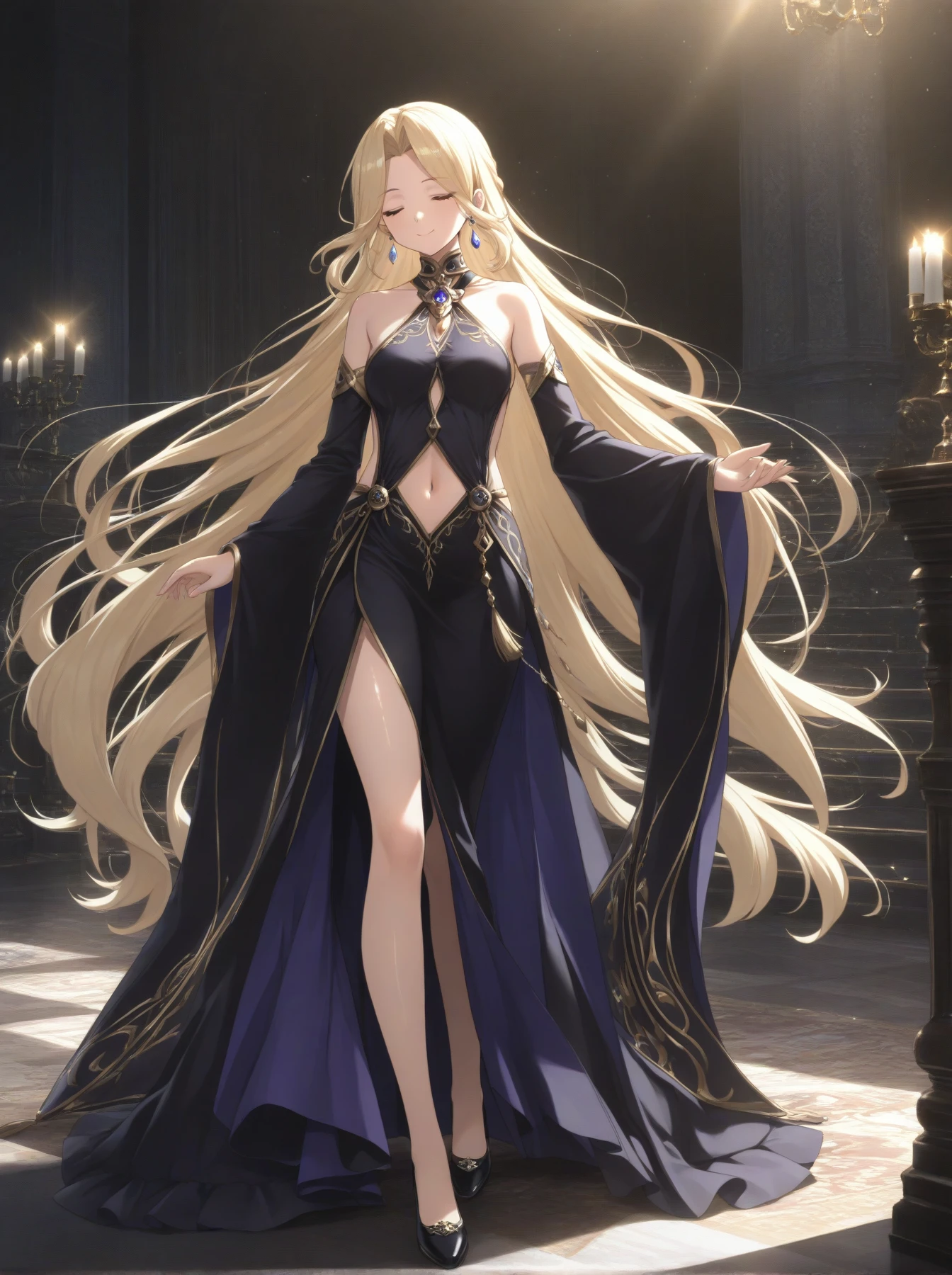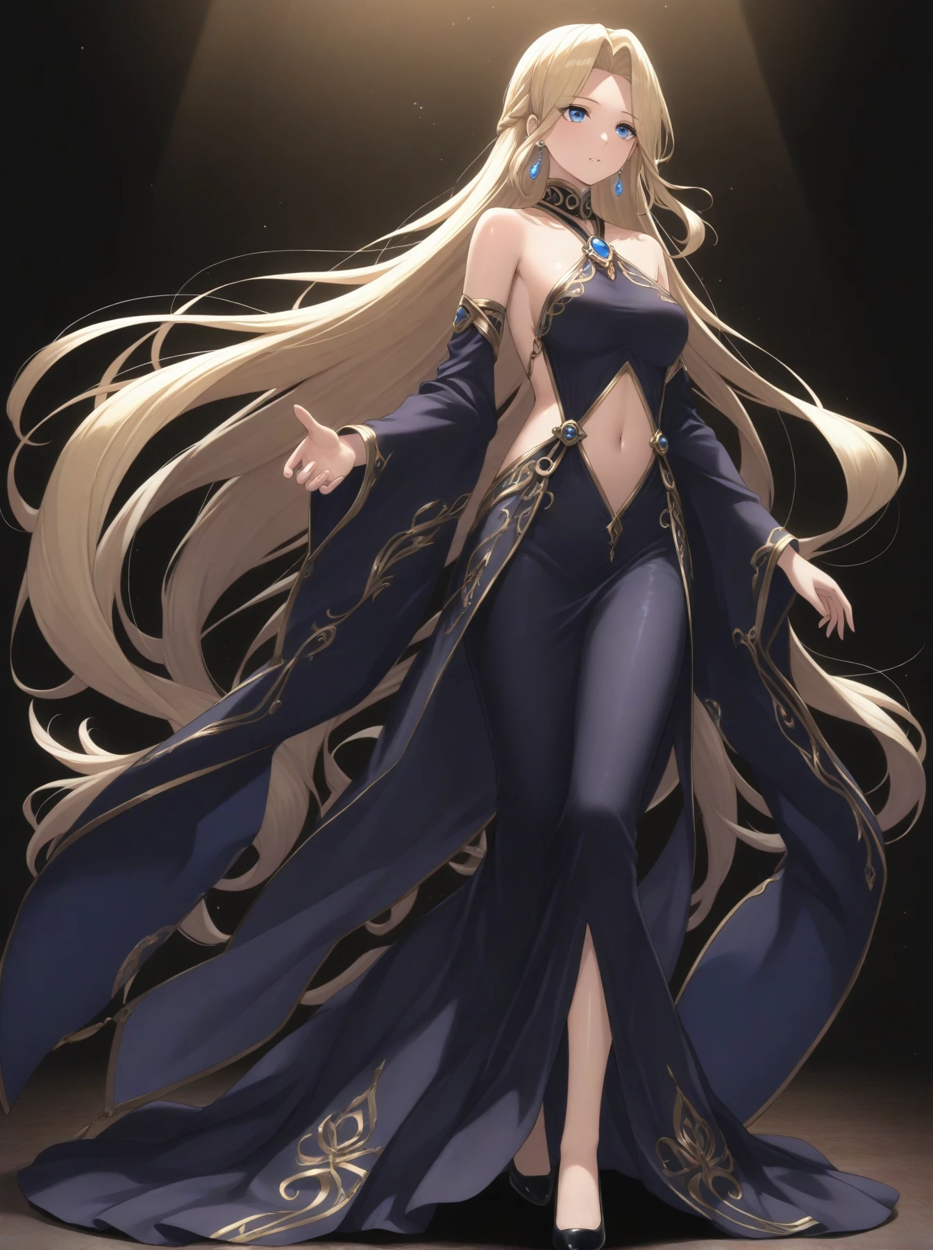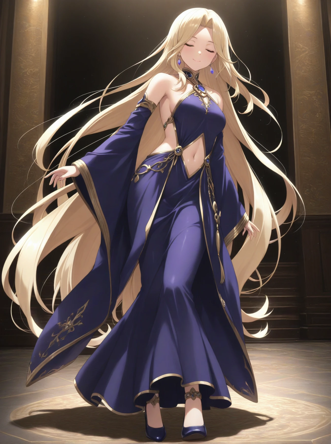 Clothes: (earrings, purple backless dress, gold trim, long dress, bare shoulders, detached sleeves, wide sleeves, navel cutout, slit dress, dress shoes)