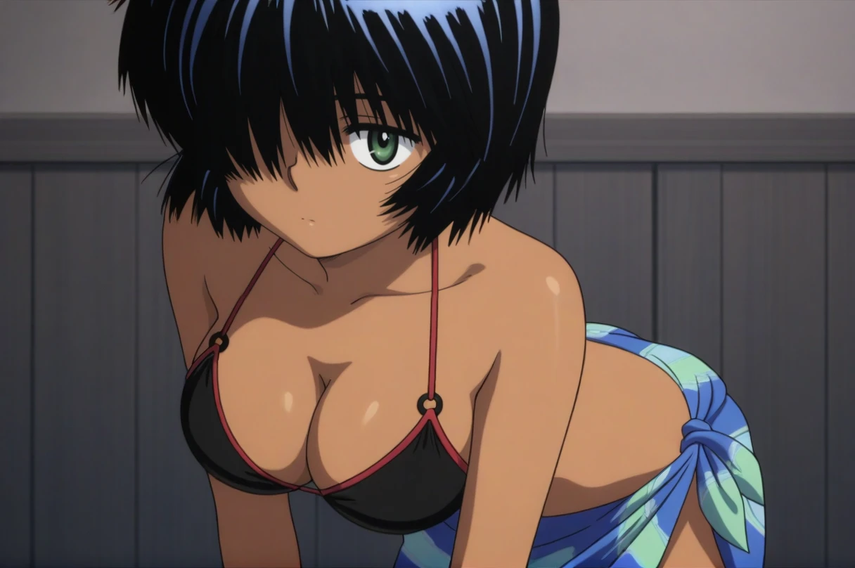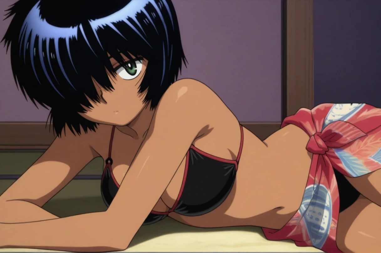 Use "Bikini" and "tan skinned" or "dark skinned female". Additionally, Also use "print sarong"