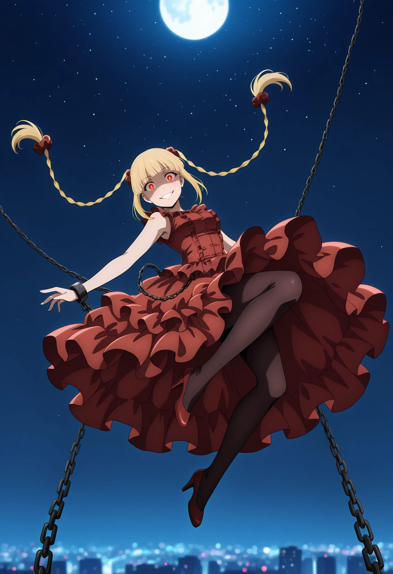 sleeveless dress, red dress, frilled dress, black pantyhose