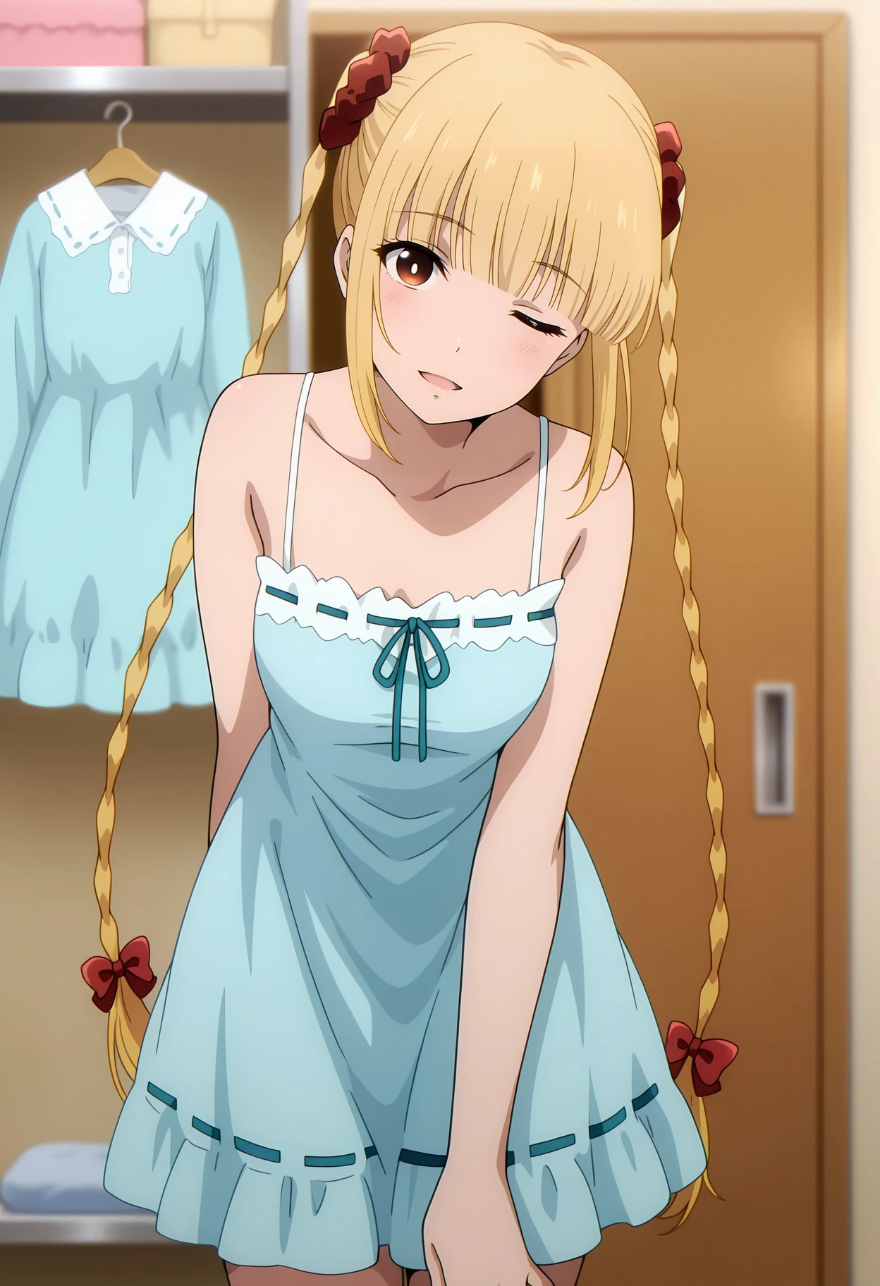 bare shoulders, blue dress, camisole, ribbon-trimmed clothes