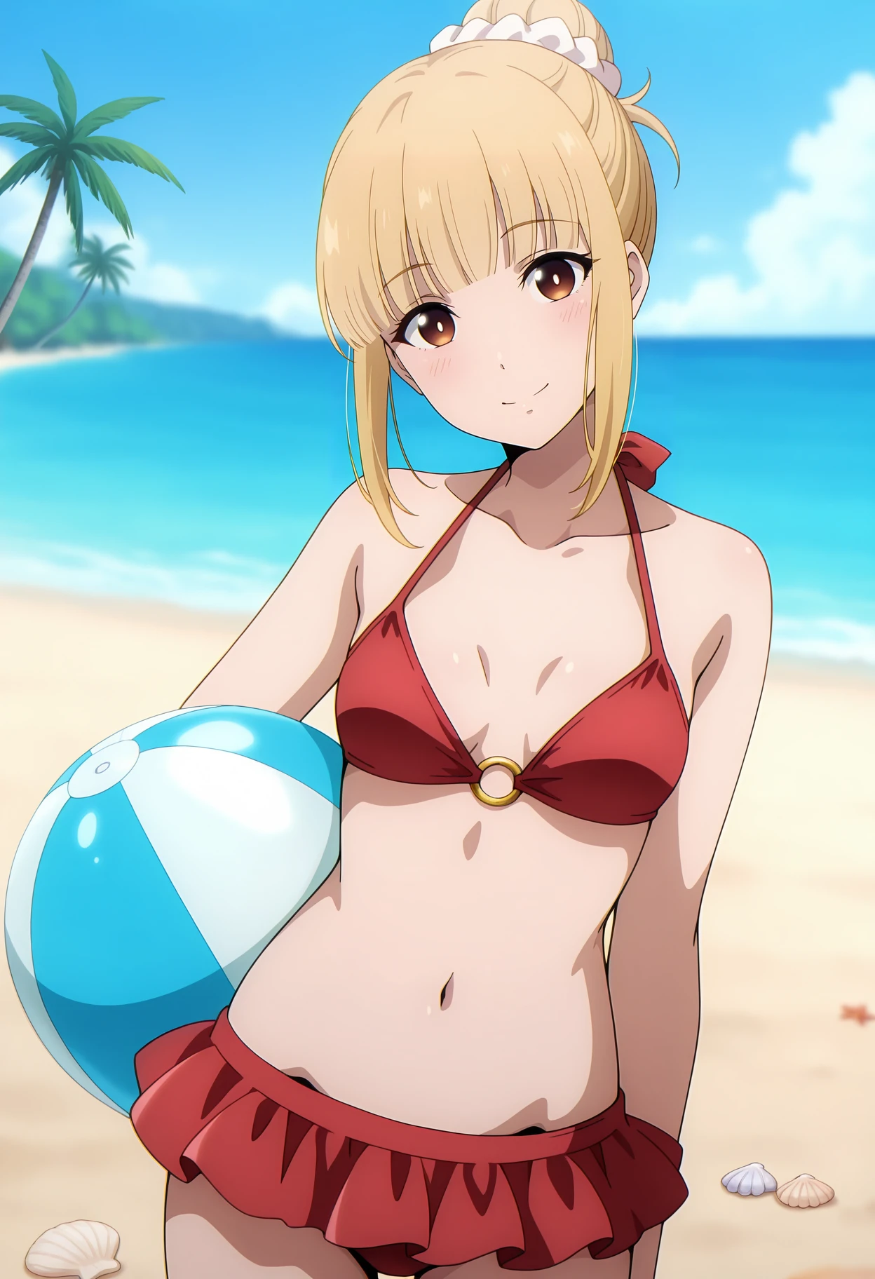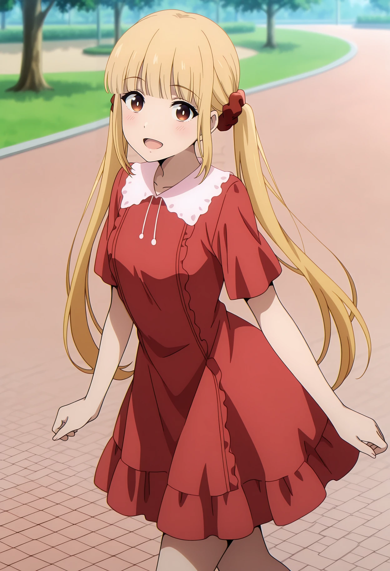twintails, blunt bangs, long hair, blonde hair, multicolored eyes, white pupils, hair scrunchie, red scrunchie