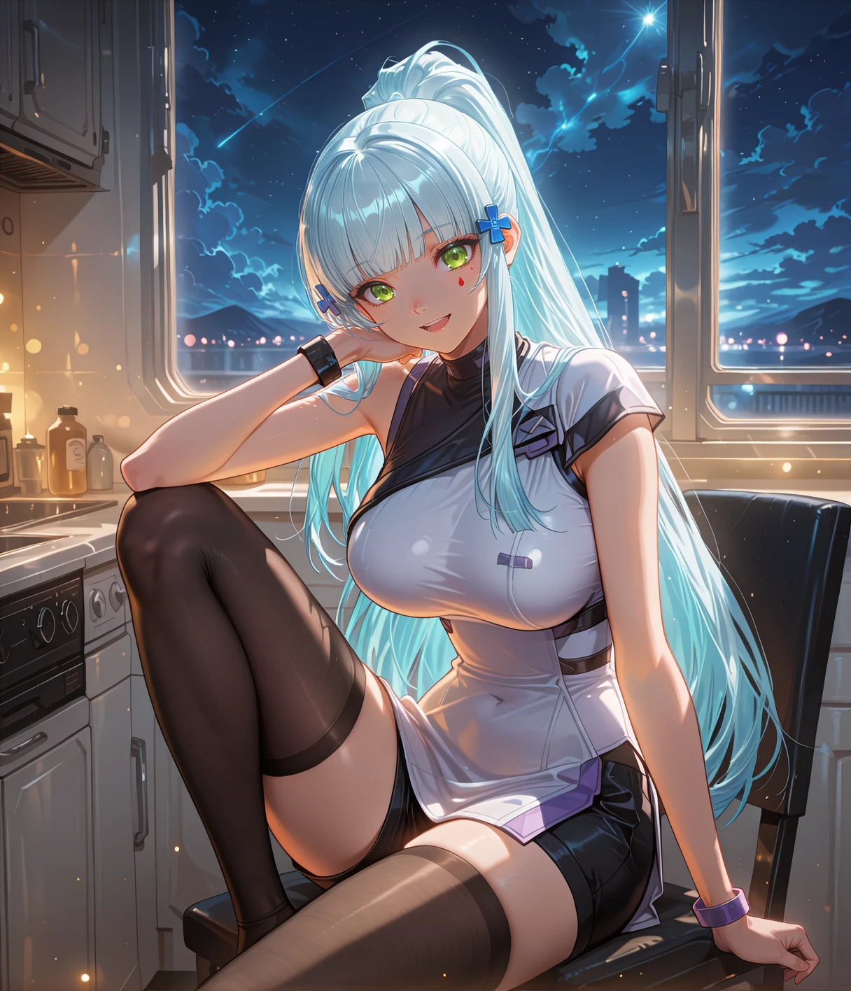 Klukmilitary, green eyes, grey hair, high ponytail, long hair, blunt bangs, side bangs, red teardrop facial mark, blue hair clip, cross hair ornament, large breasts,hooded jacket, blue jacket, long sleeves, tactical clothes, black bodysuit, black fingerless gloves, belt, cleavage cutout,cleavage,fishnet thighhighs, knee pads, black high heel boots, thigh pouch, thigh holster, belt pouch,