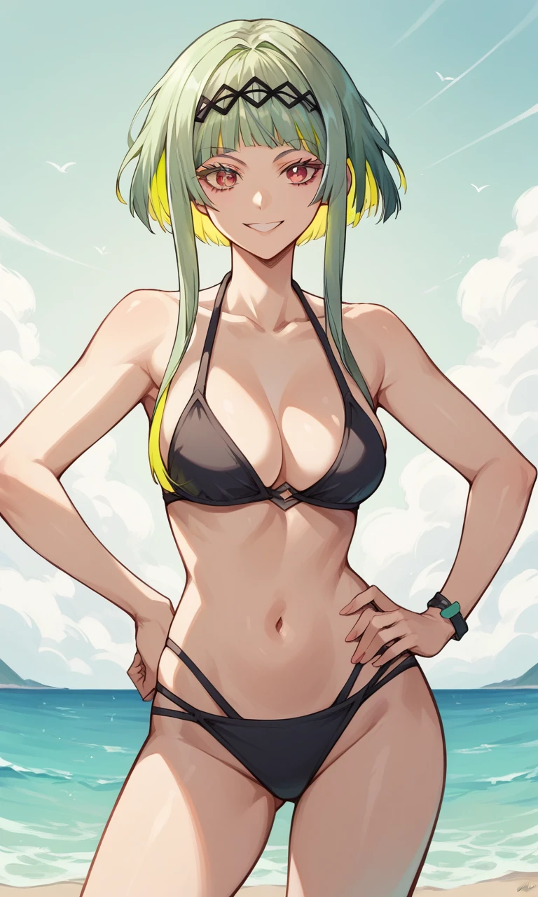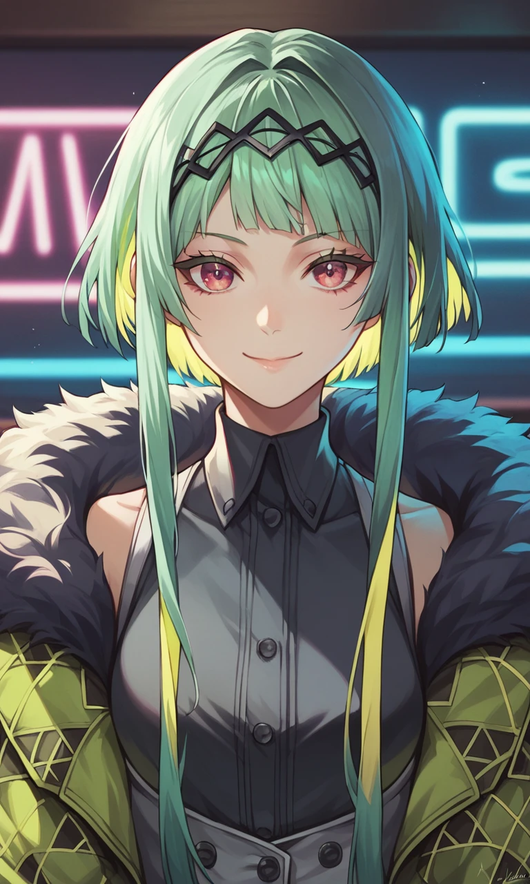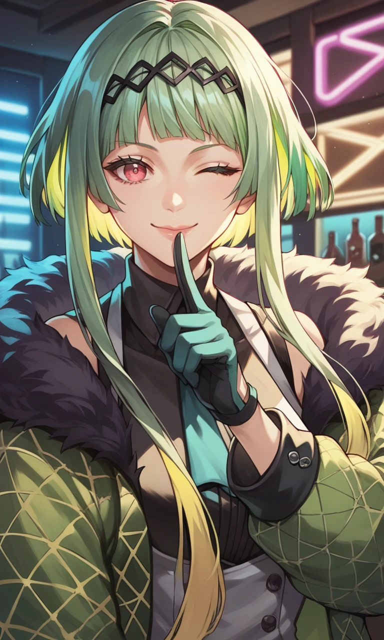 Ringo, short hair with long locks, jacket, multicolored hair, green hair, shorts, gloves, hairband