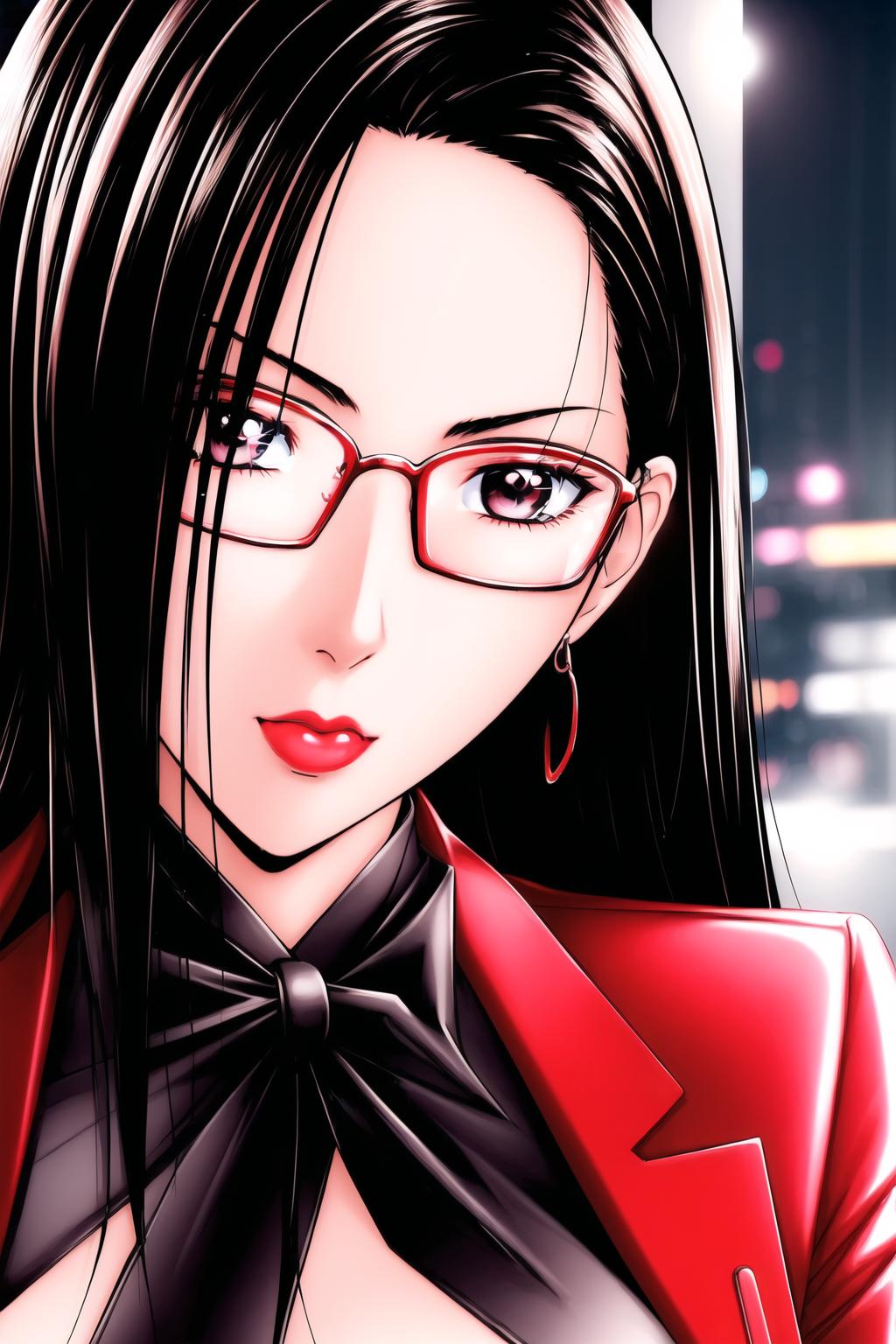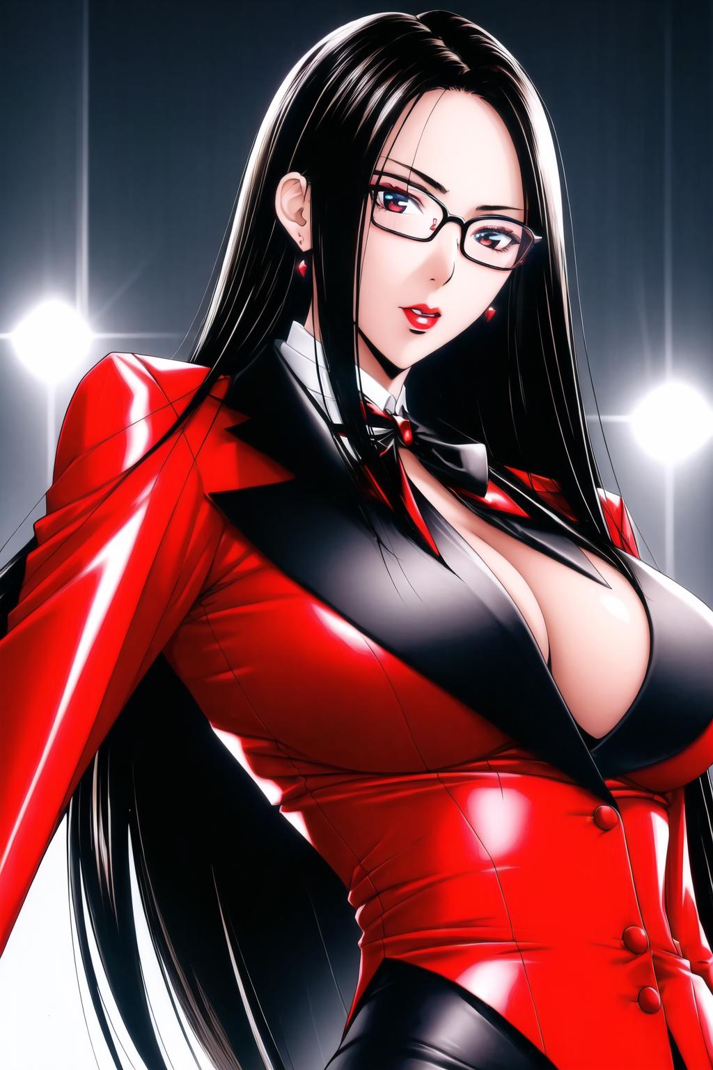 red suit,red_jacket,earrings, glasses,formal,long_sleeves,suit,
