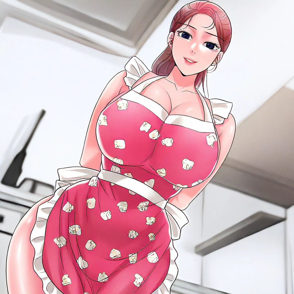 2. ((short-sleeves cut-out white top, obscene cleavage, huge cleavage, denim shorts with black belt, )) white high-heels, white-striped pink apron with frilled pink edges,