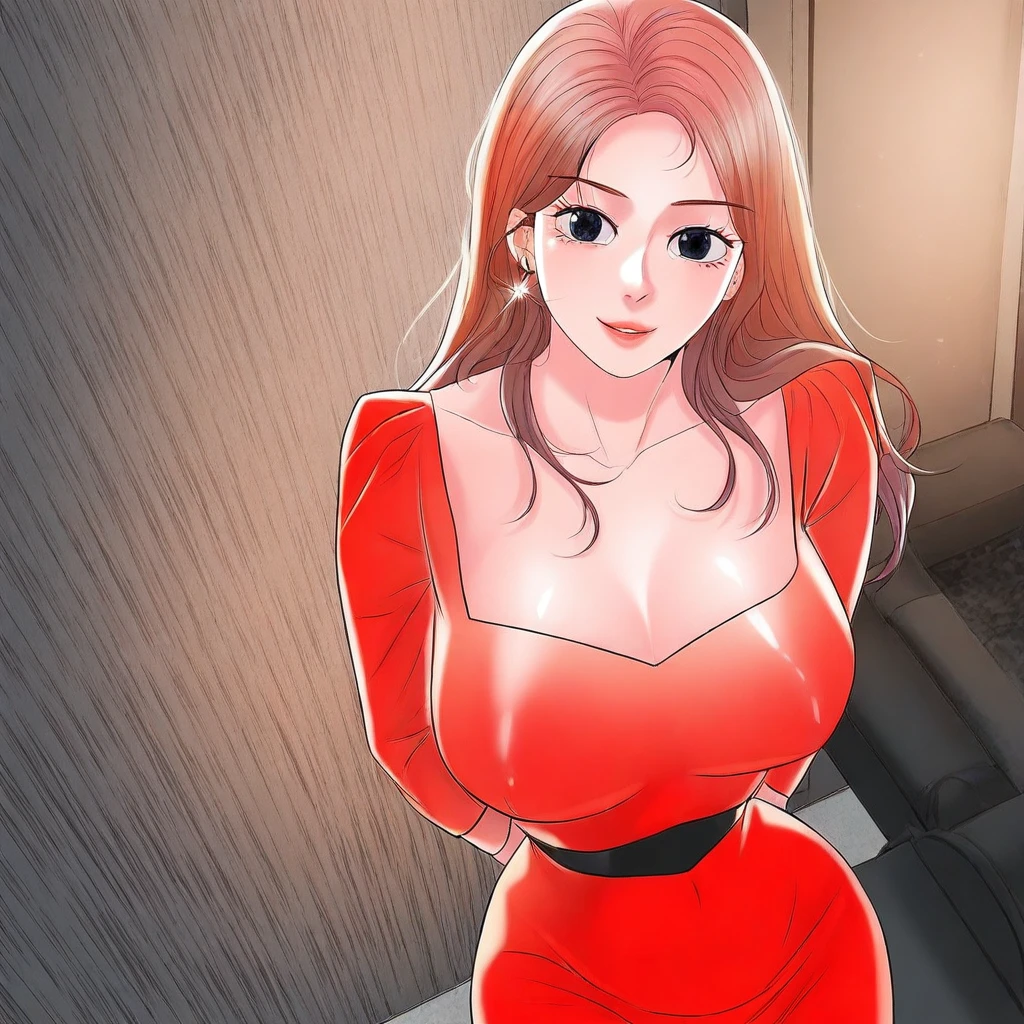 19. ((sexy ?????? medium-sleeves long red dress with black belt, beautiful gold earring with diamond gem, )) sexy pink panties,