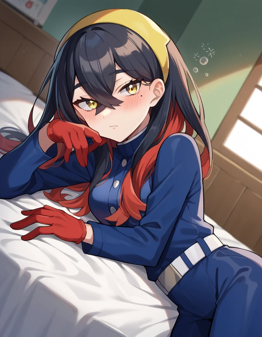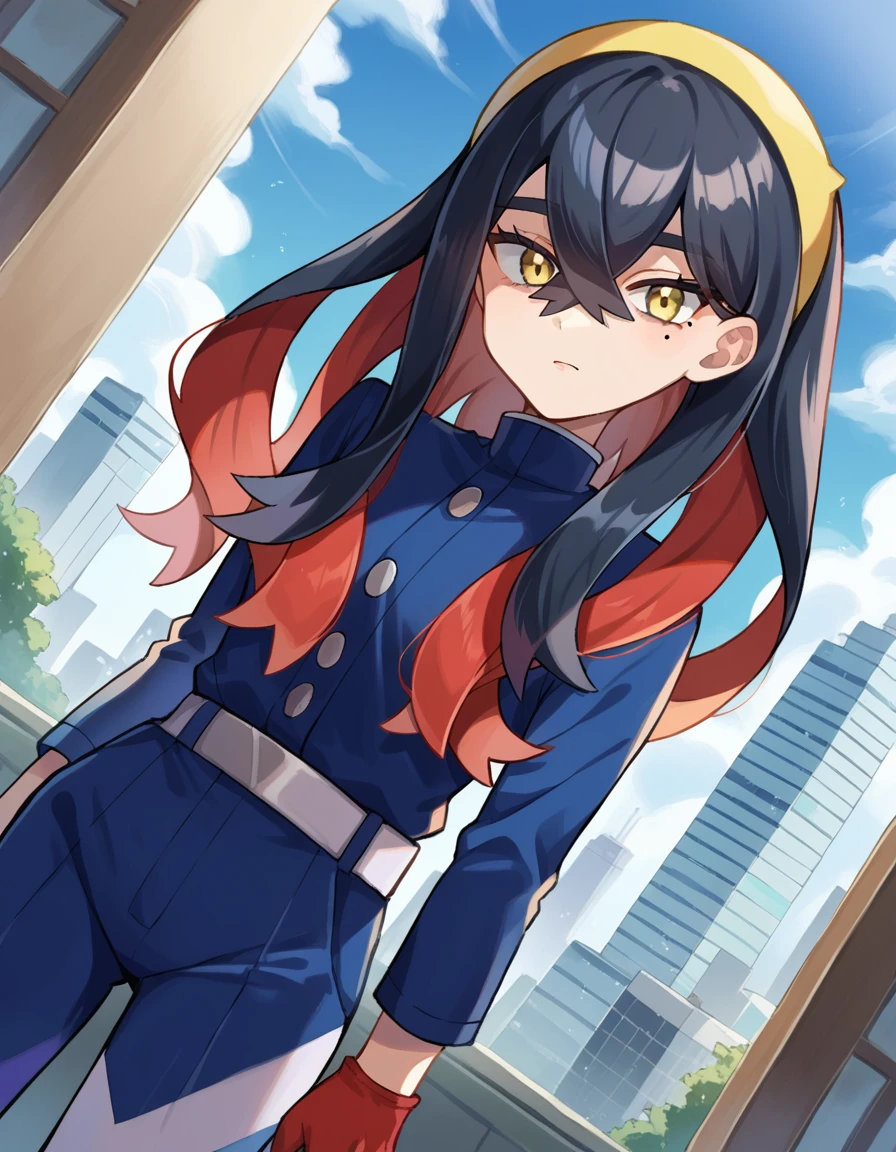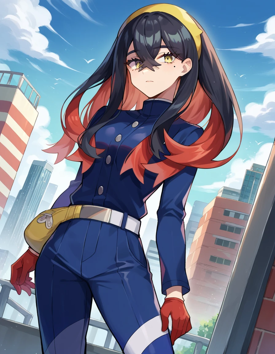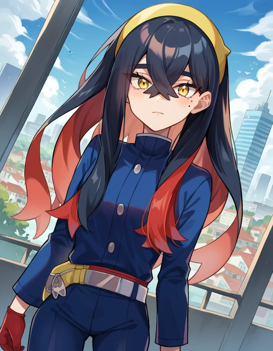 pokemoncarmine, black hair, colored inner hair, crossed bangs, hair between eyes, hairband, long hair, mole, mole under eye, multicolored hair, red hair, sidelocks, two-tone hair, yellow eyes, yellow hairband,