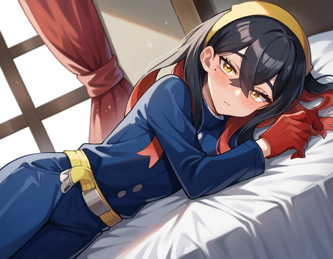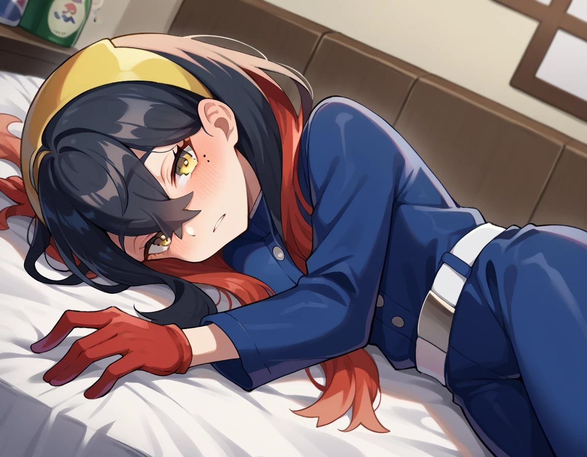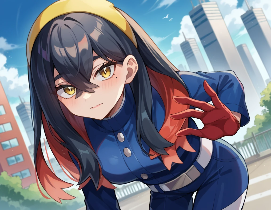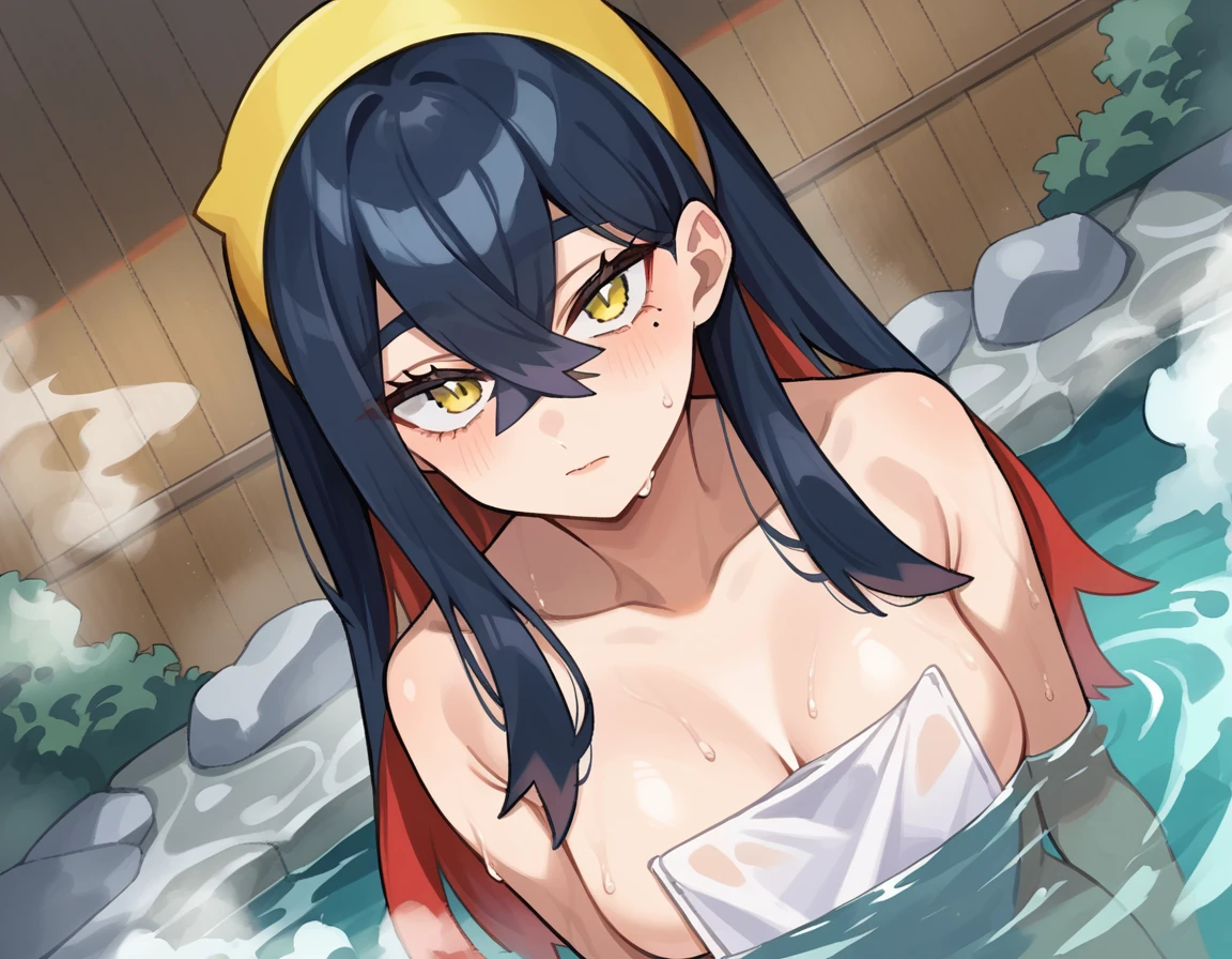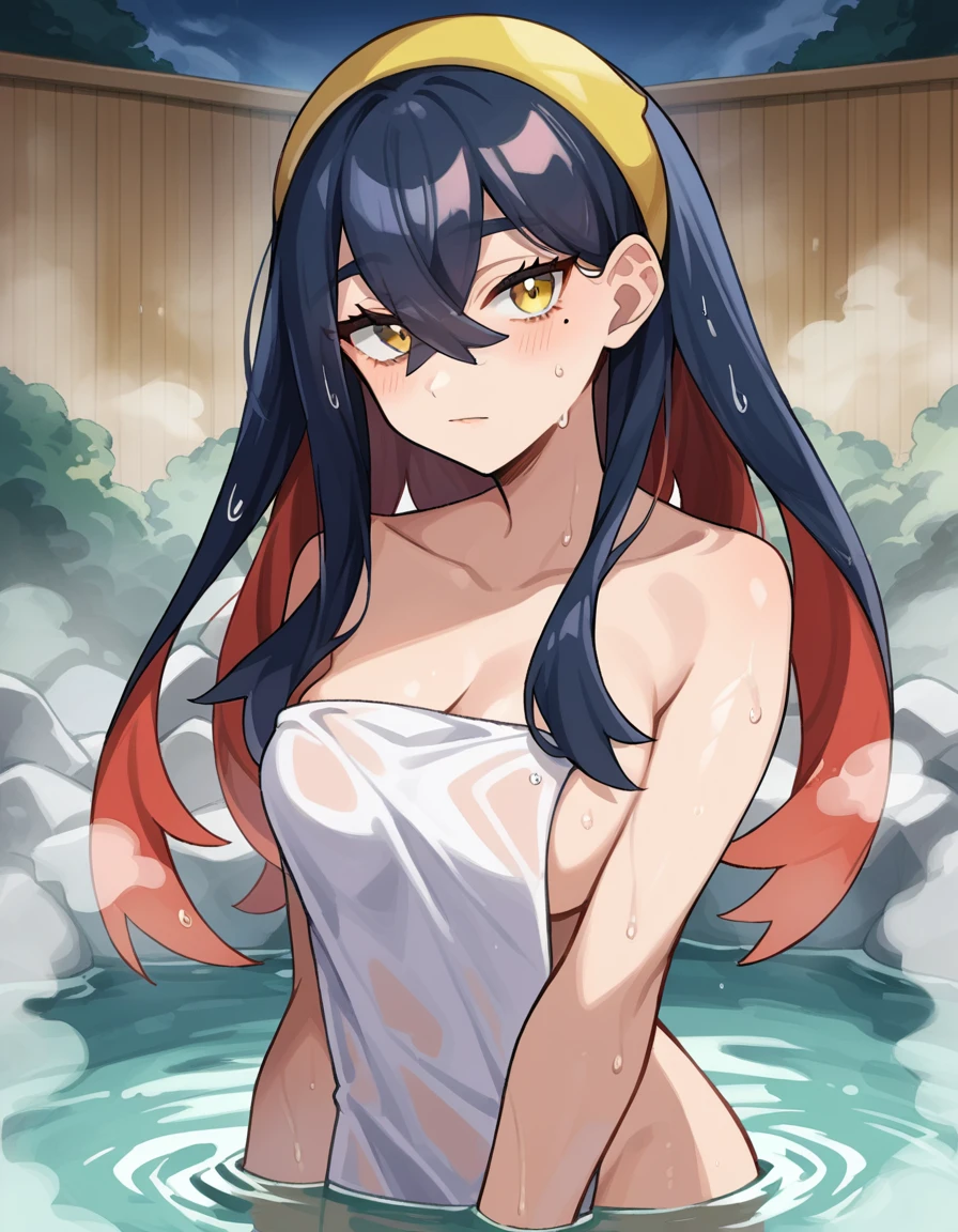 pokemoncarmine, black hair, colored inner hair, crossed bangs, hair between eyes, hairband, long hair, mole, mole under eye, multicolored hair, red hair, sidelocks, two-tone hair, yellow eyes, yellow hairband,