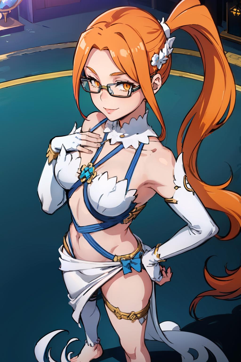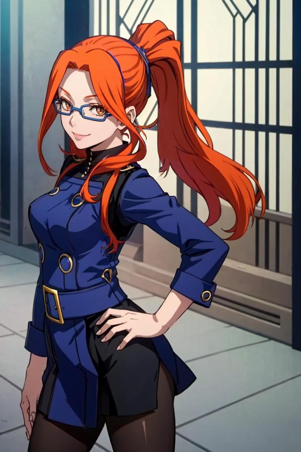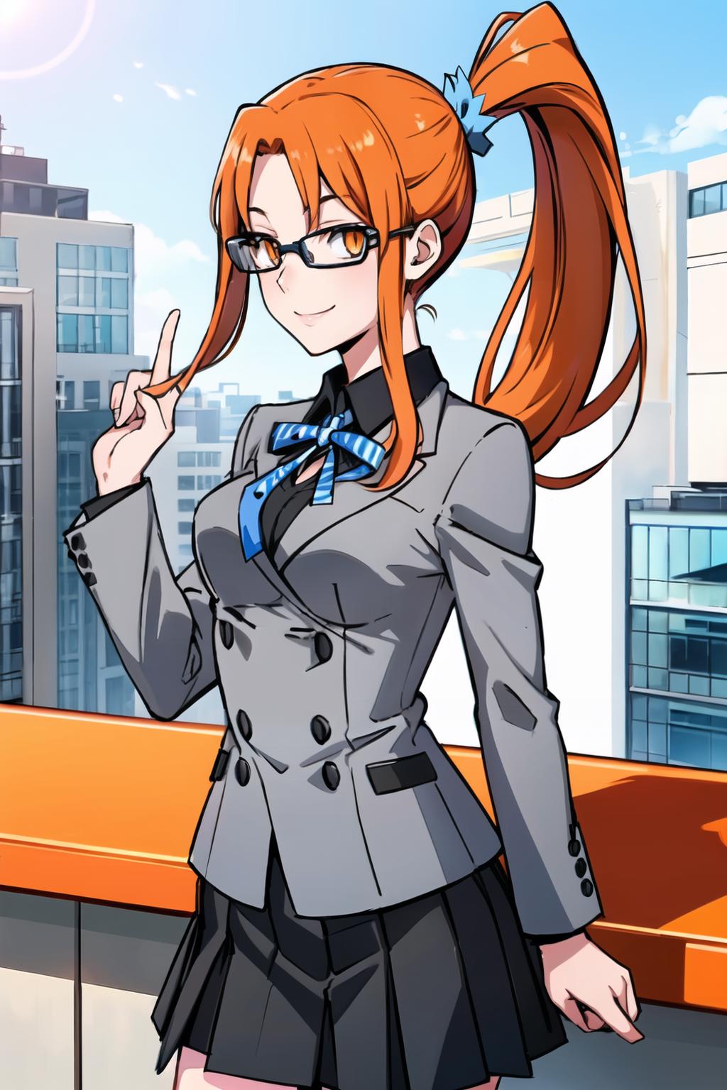 For her normal look it's "midriff, glasses, gloves, skirt, ponytail, cleavage, necktie, hair ornament"