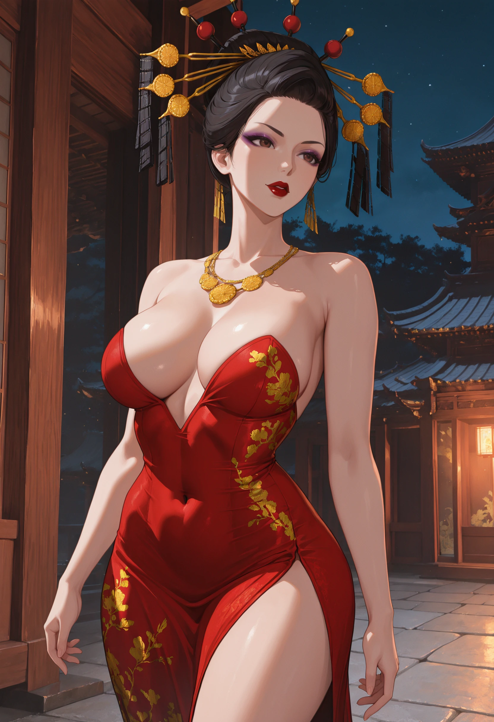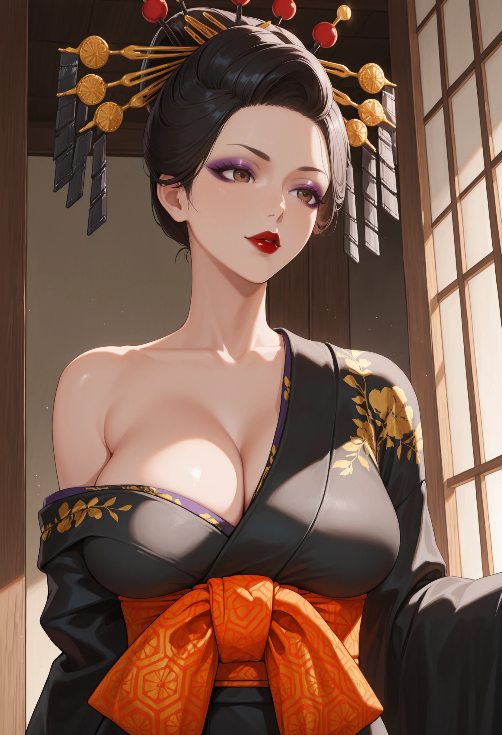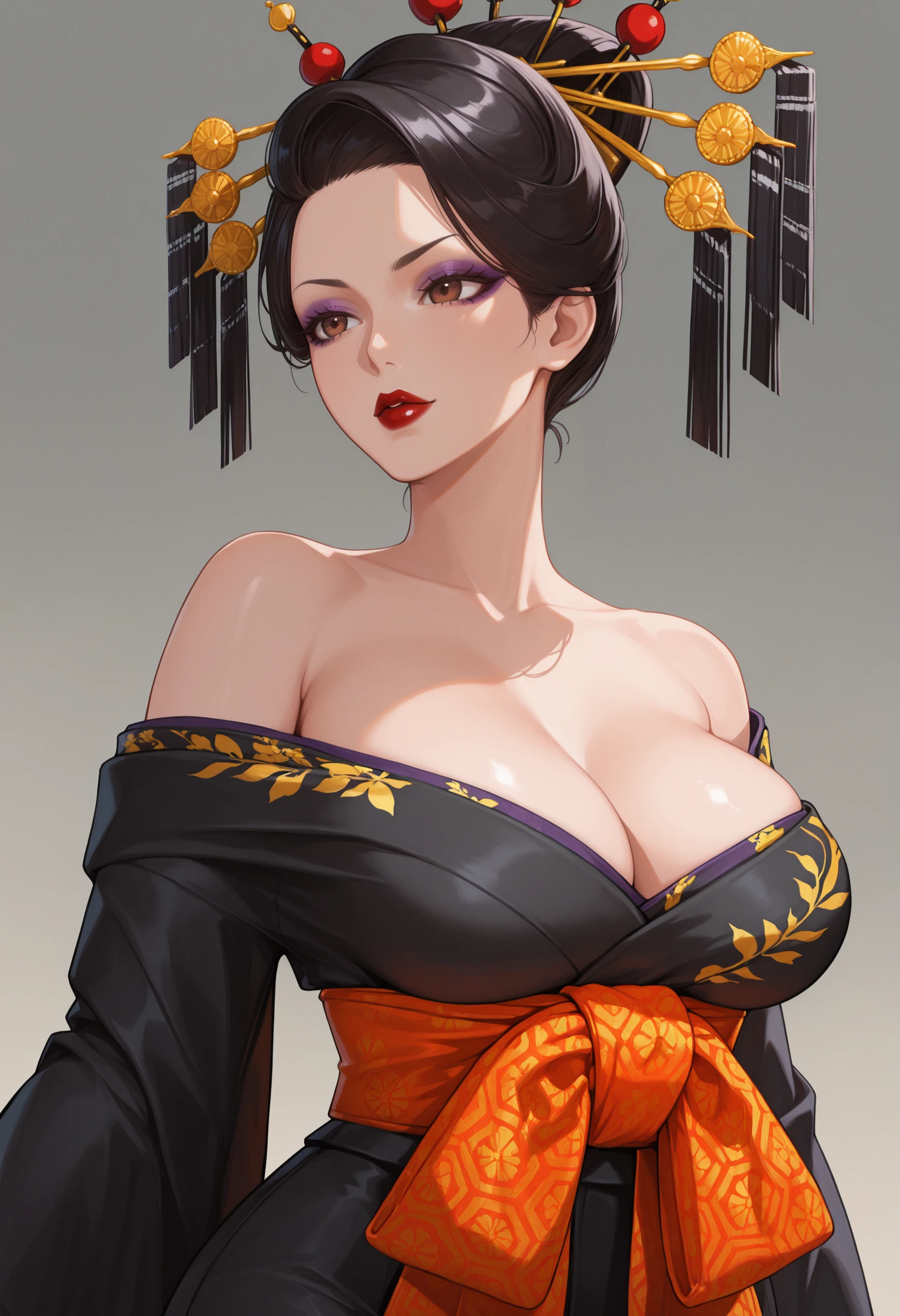 mdmm, brown eyes, black hair, hair stick, hair ornament, makeup, red lips, single bare shoulder, black kimono, orange sash, japanese clothes, large breasts