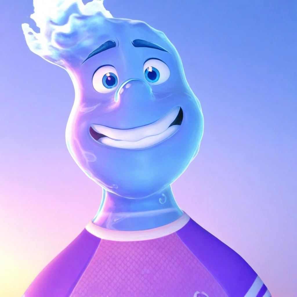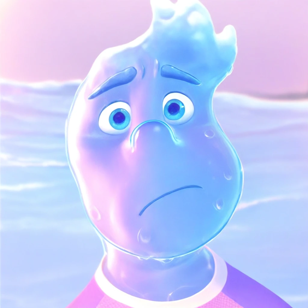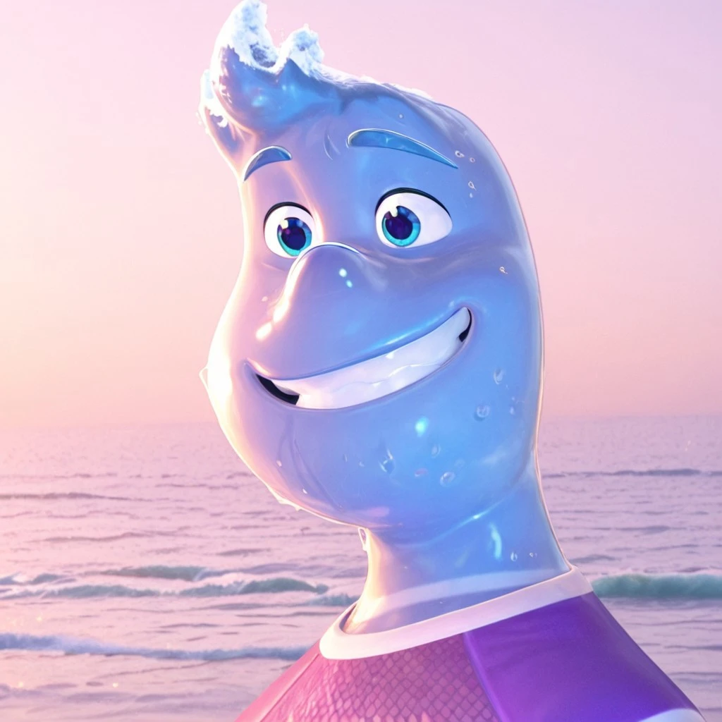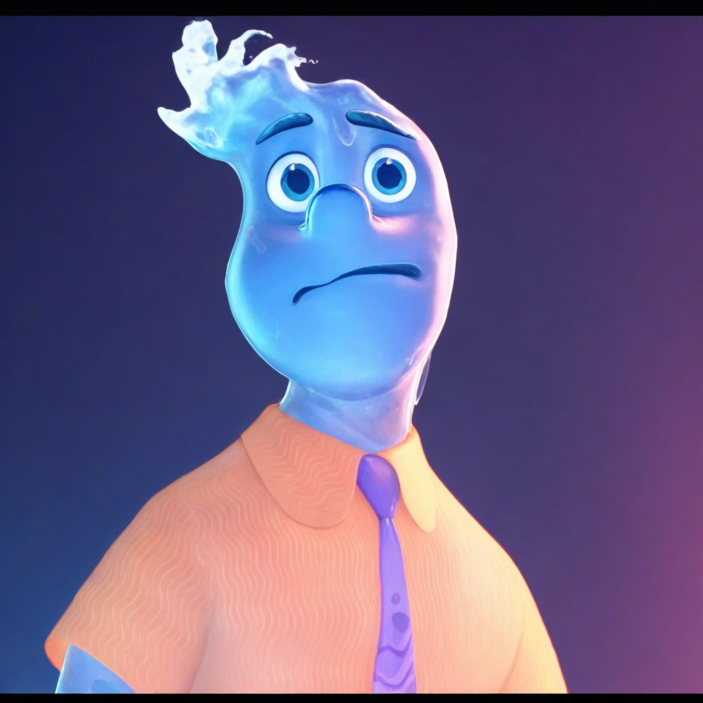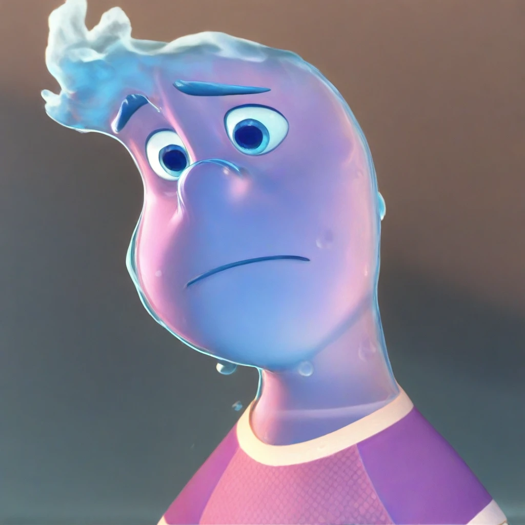 Wade, wet, water, 1boy, solo, completely made out of translucent blue water, waves that resemble hair, eyebrows are a cerulean-blue color, small round nose, blue eyes, purple T-shirt with white trim around the collar bottom and darker-colored sleeves, sleeves have white stripe on them, casual business attire, pale yellow polo shirt with thin wavy white stripes, necktie that sports a light purple and light blue gradient,
