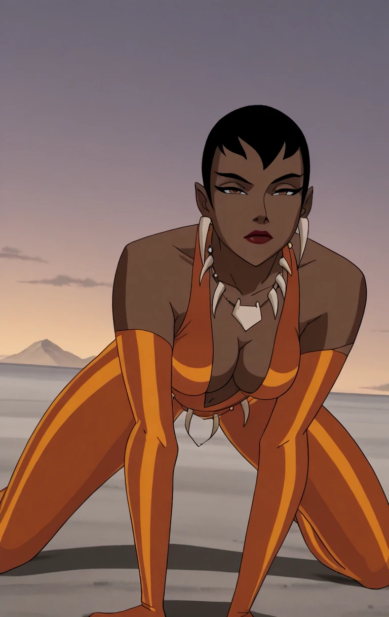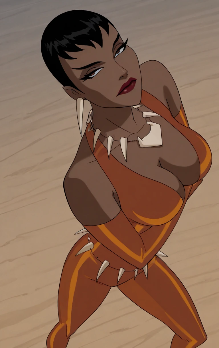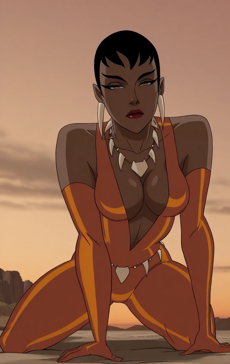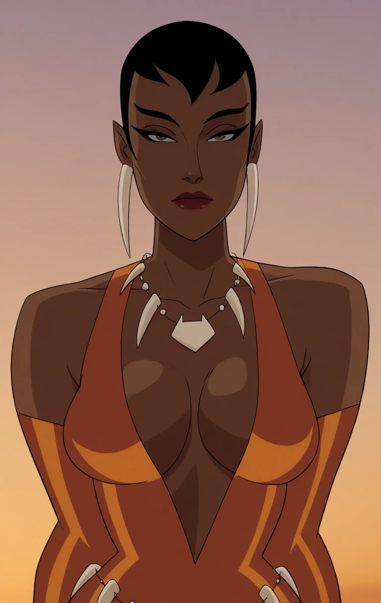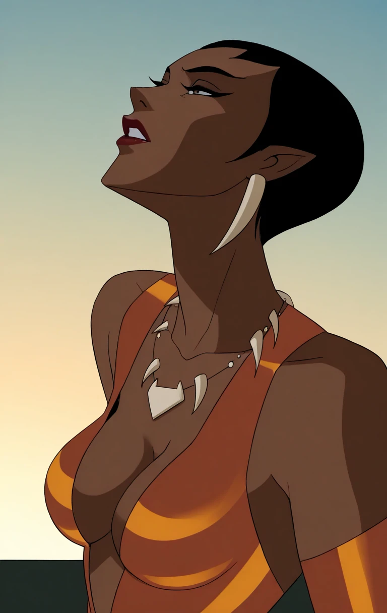 1girl, solo, breasts, short hair, black hair, cleavage, jewelry, medium breasts, earrings, sky, dark skin, necklace, pointy ears, dark-skinned female, colored skin, colored sclera, tusks,v1x3nxc,