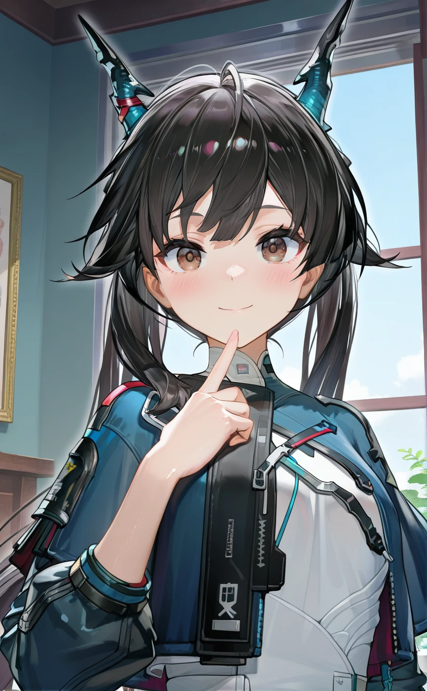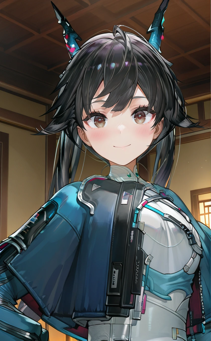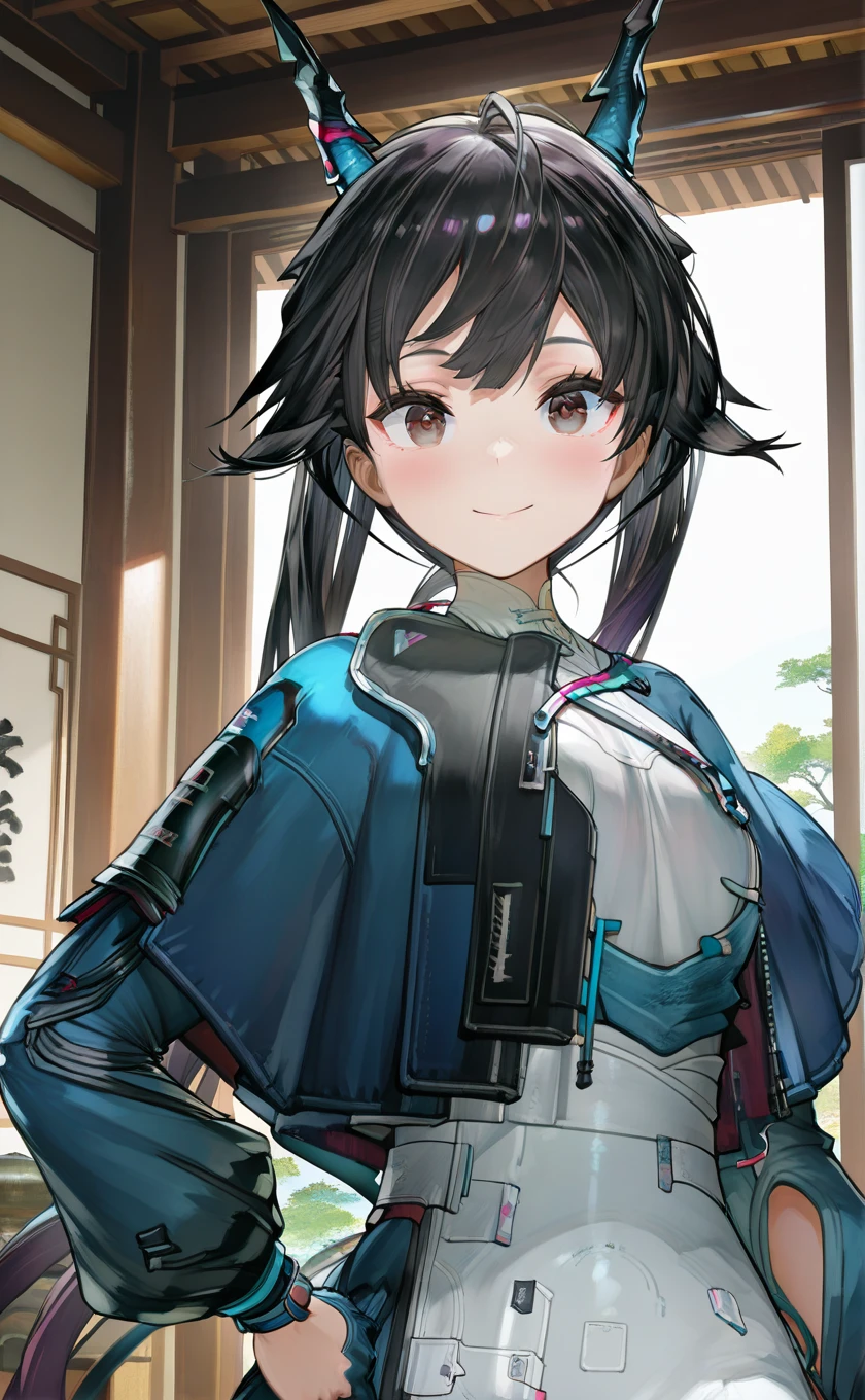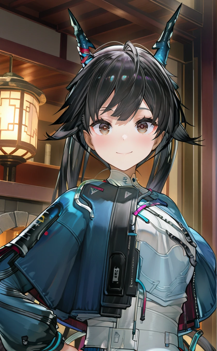 dragon horns,long hair,black hair,sidelocks,brown eyes