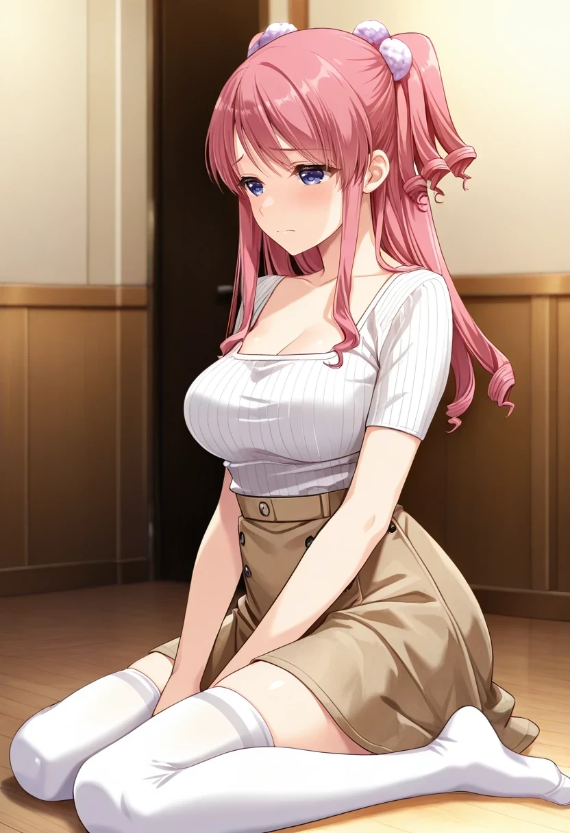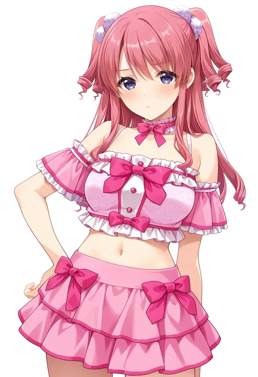 bare shoulders,white gloves,crop top,pink bow,pink skirt,frills,white thighhighs,Casual: