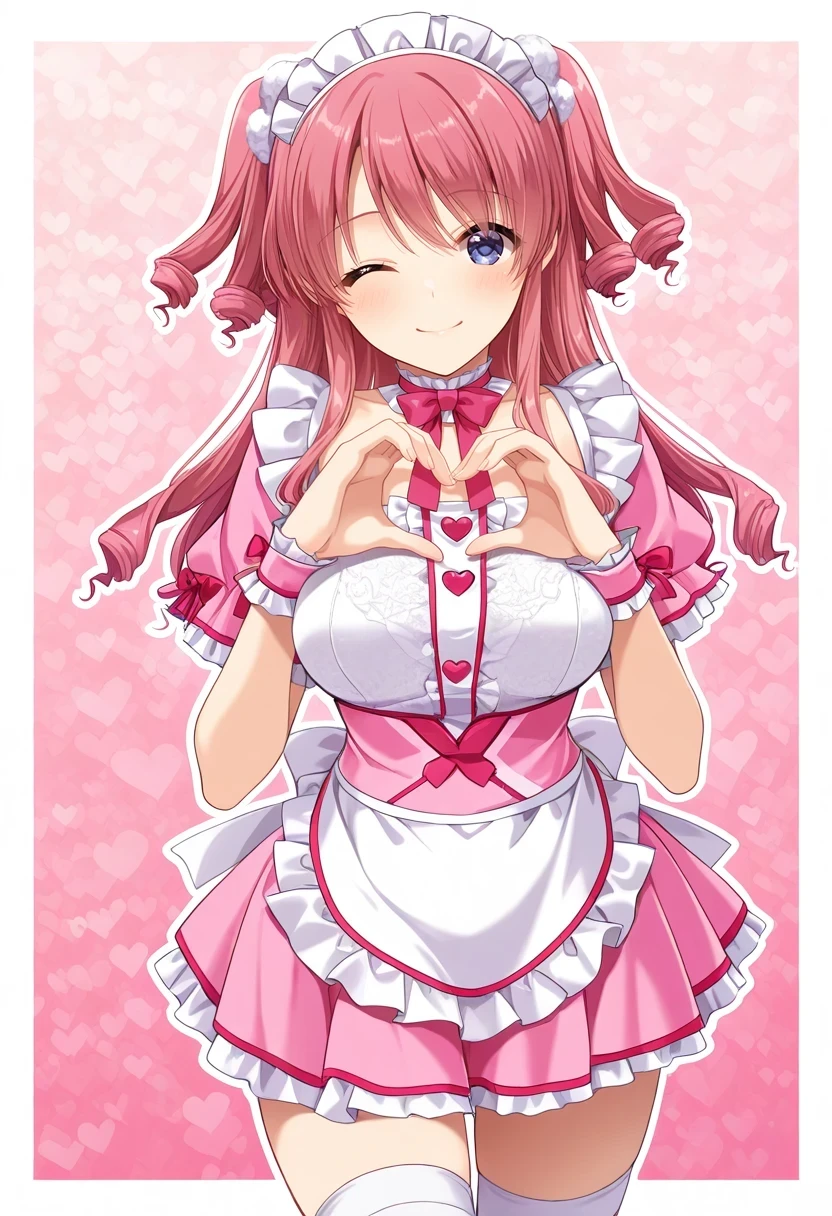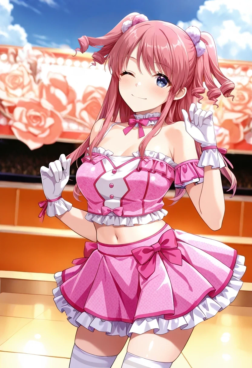 shoulders,white gloves,crop top,pink bow,pink skirt,frills,white thighhighs,