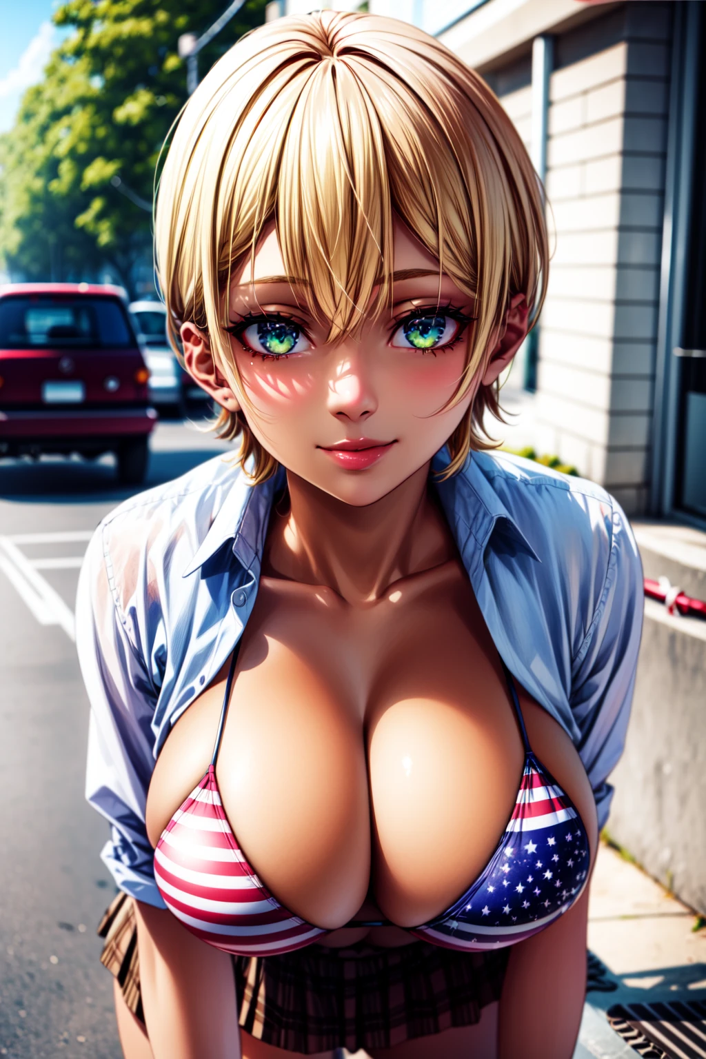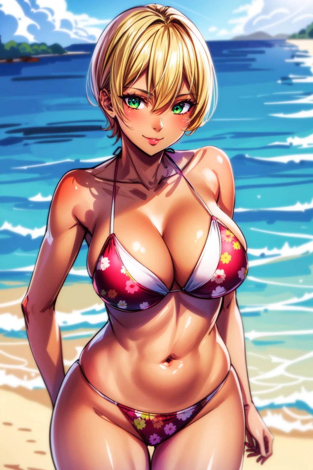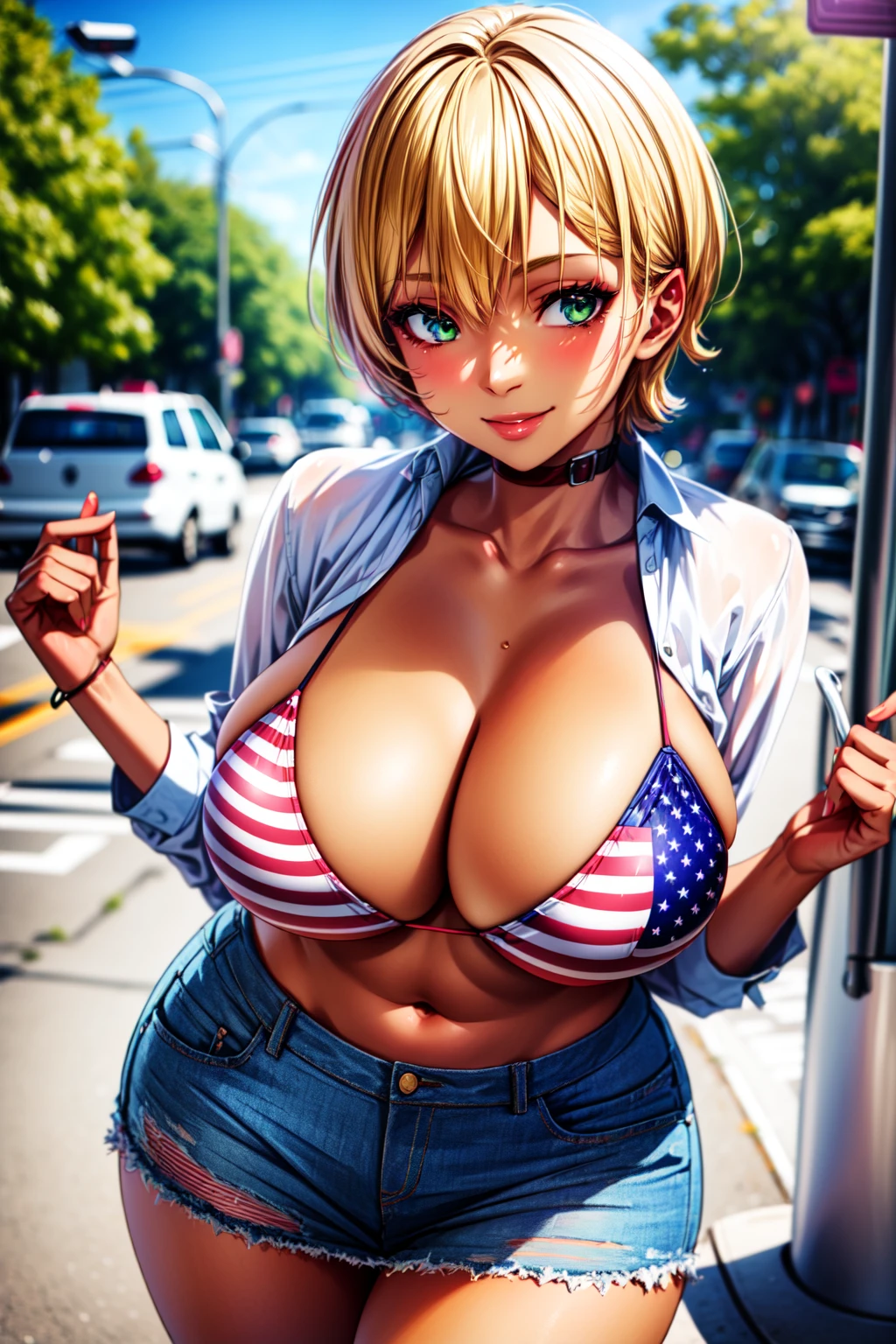 MitoIkumi_NDV, 1girl, green eyes, blonde hair, short hair, large breasts, dark-skinned female, dark skinBest weight: 0.6-0.8