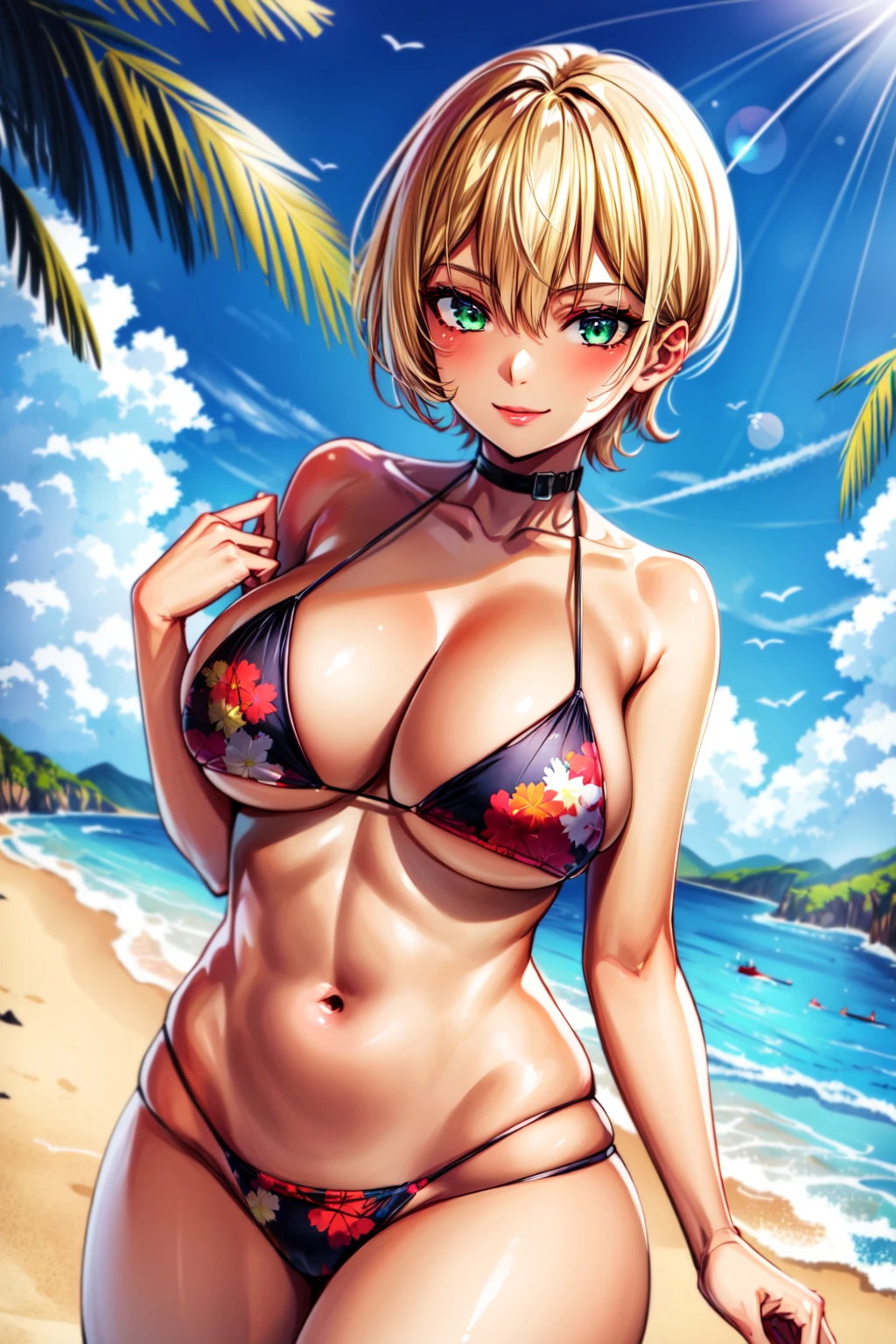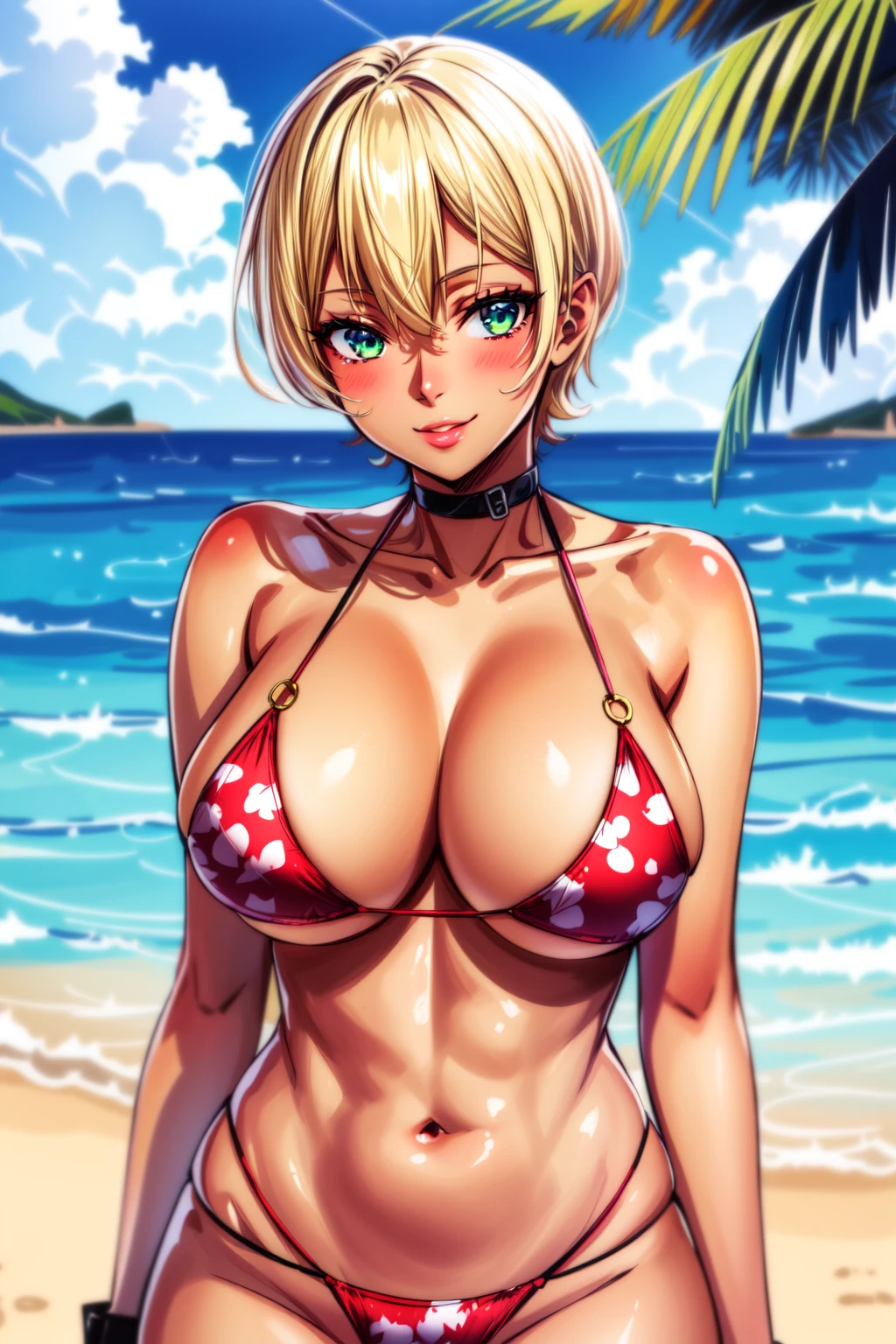 MitoIkumi_NDV, 1girl, green eyes, blonde hair, short hair, large breasts, dark-skinned female, dark skin