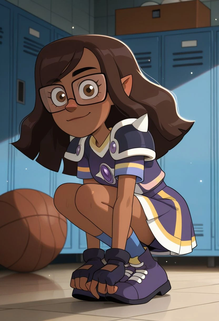 Alt outfit: gym uniform, sportswear, shoulder armor, fingerless gloves, skirt, boots, kneepads, (optional: asymmetrical glasses, tinted eyewear)