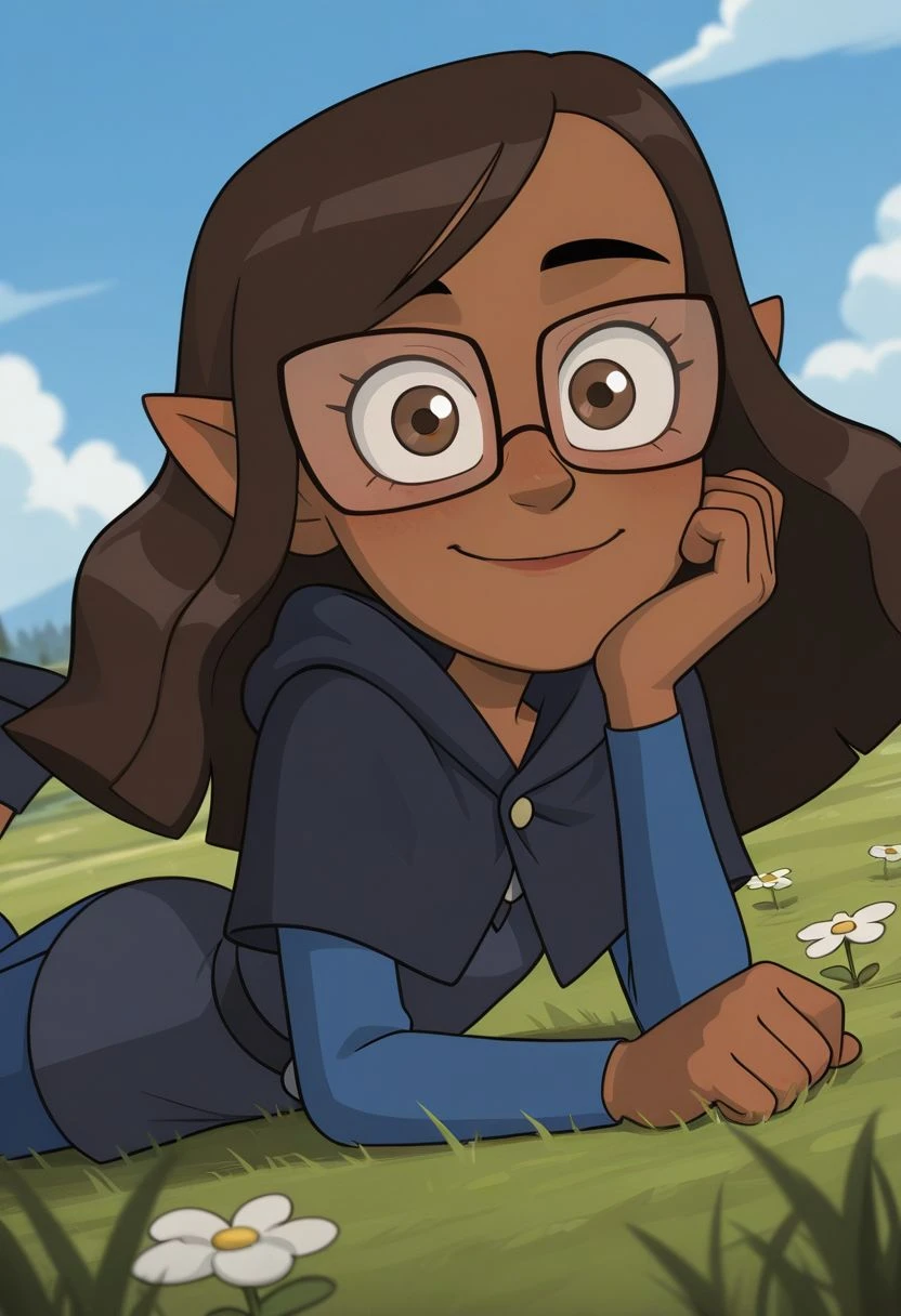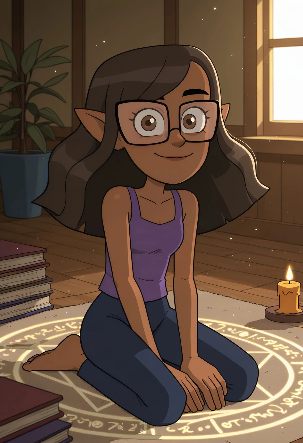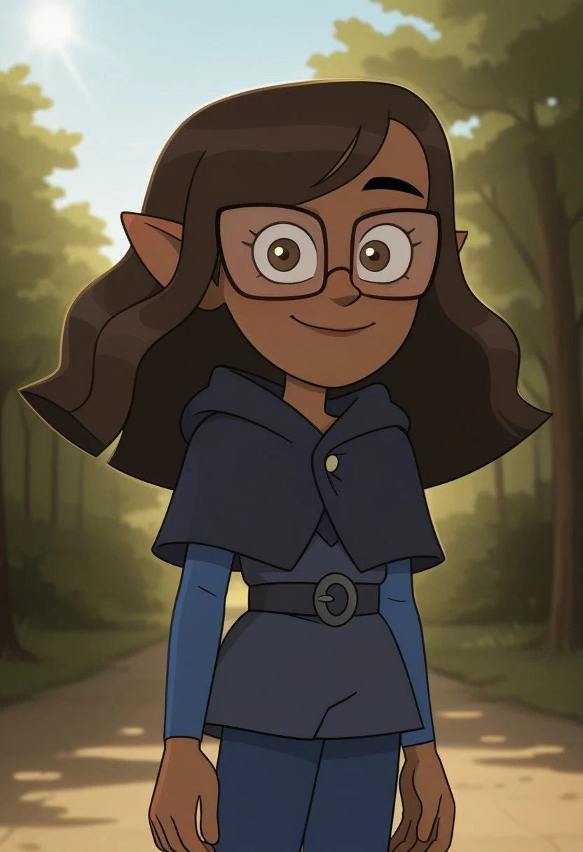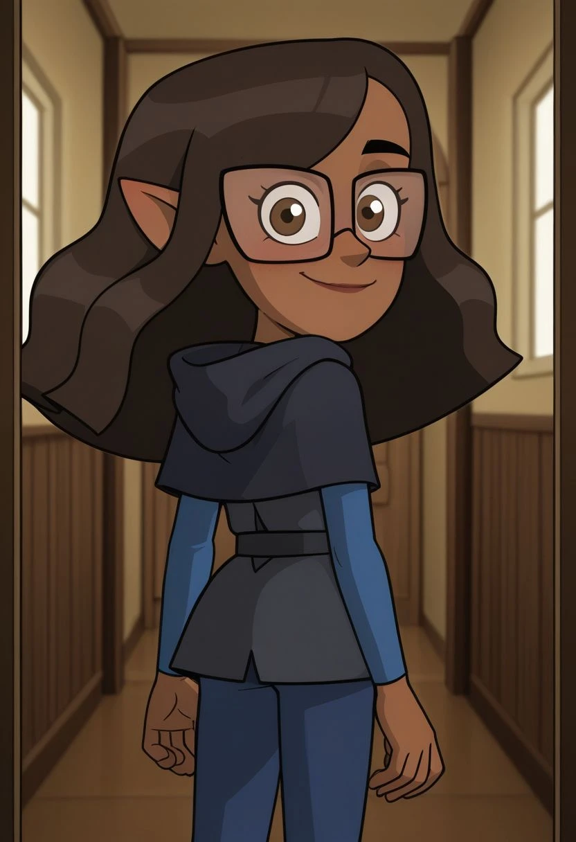 Prompt: cat_(the_owl_house), 1girl, brown hair, long hair, dark-skinned female, brown eyes, capelet, long sleeves, belt, blue pants