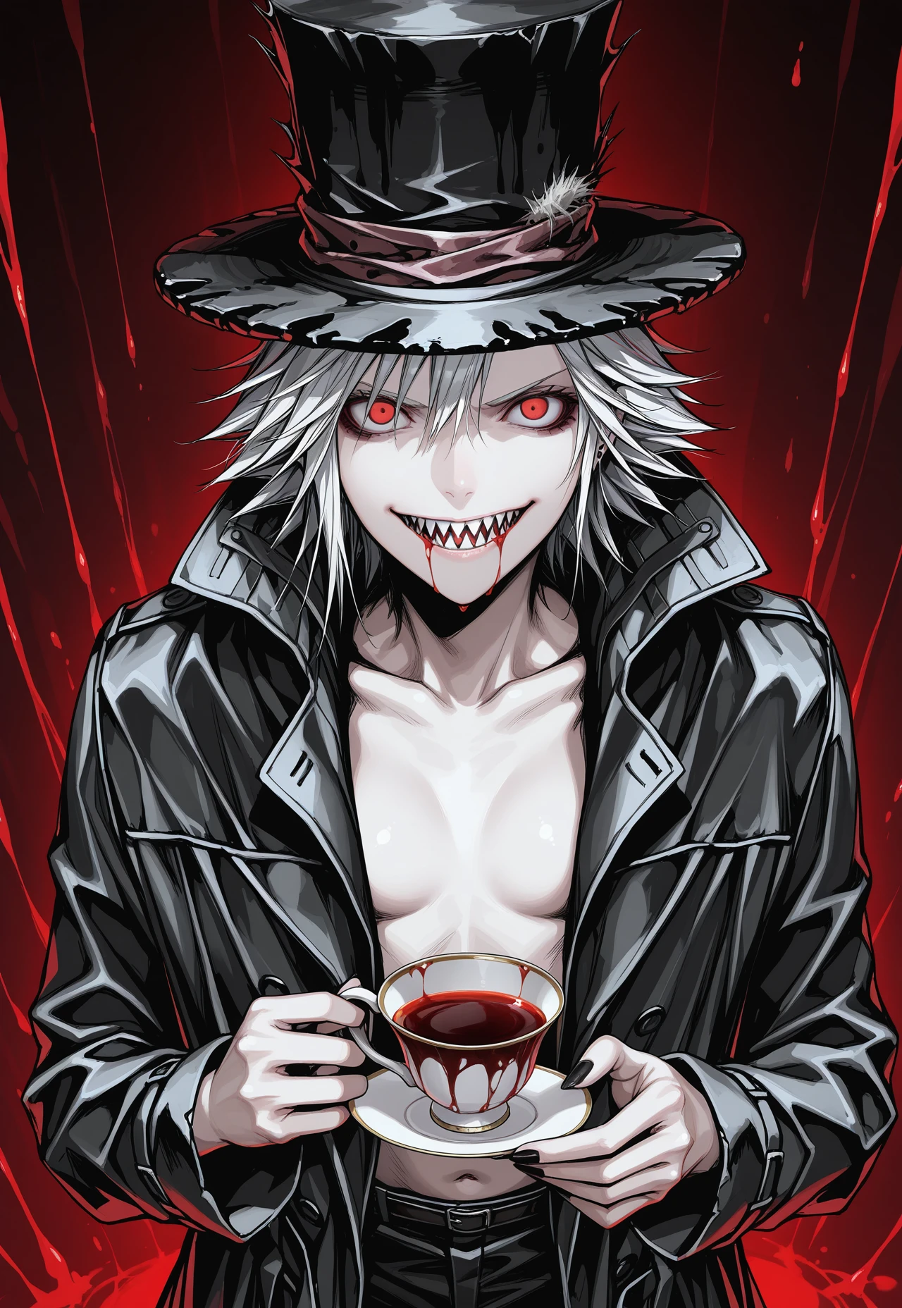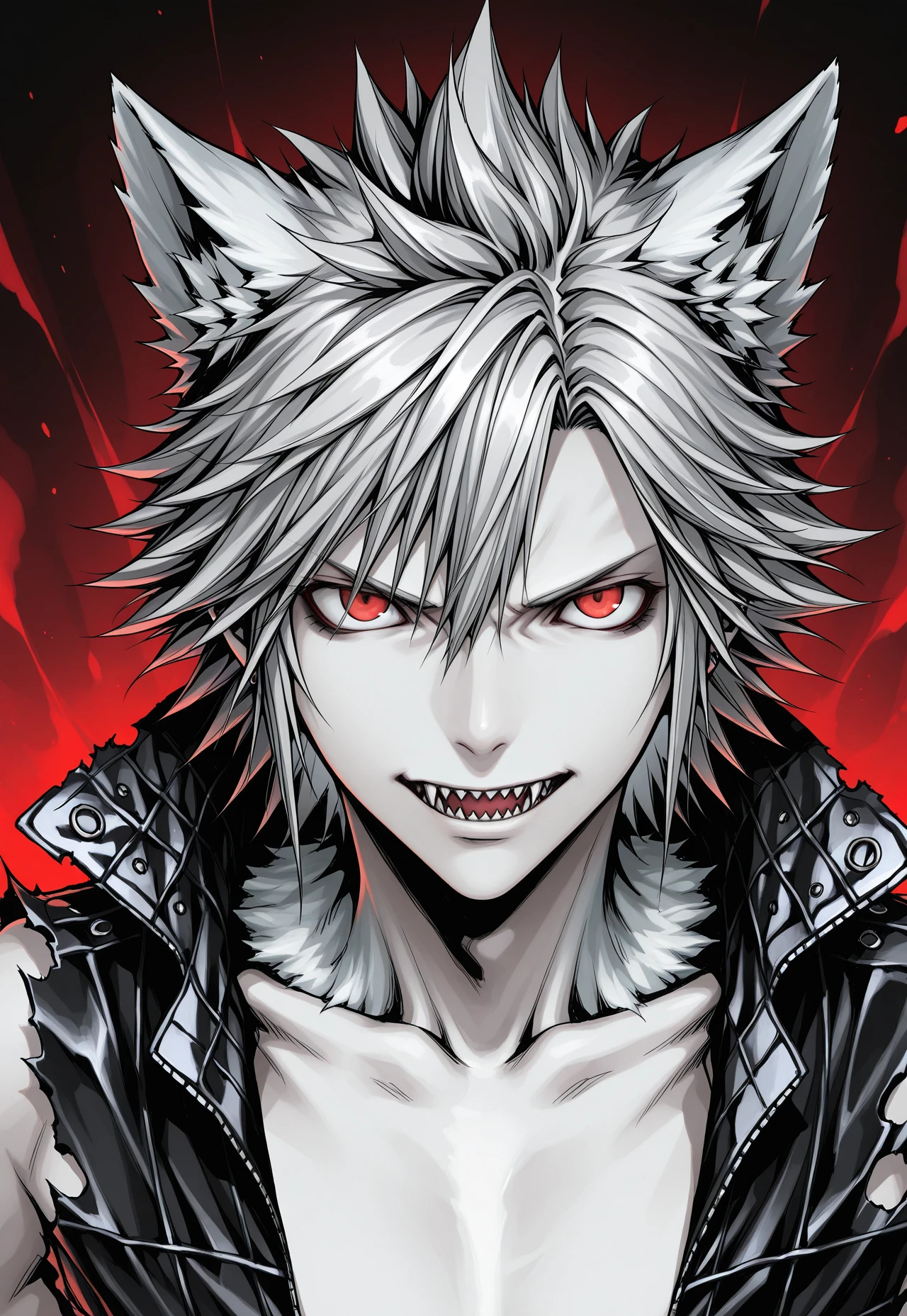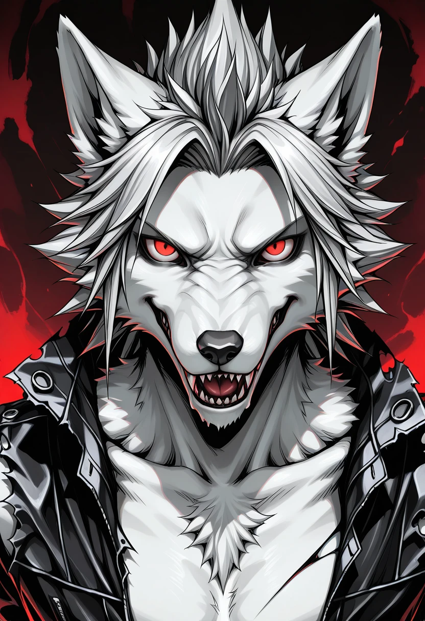 WHITE HAIR, RED EYES, SHARP TEETH,
