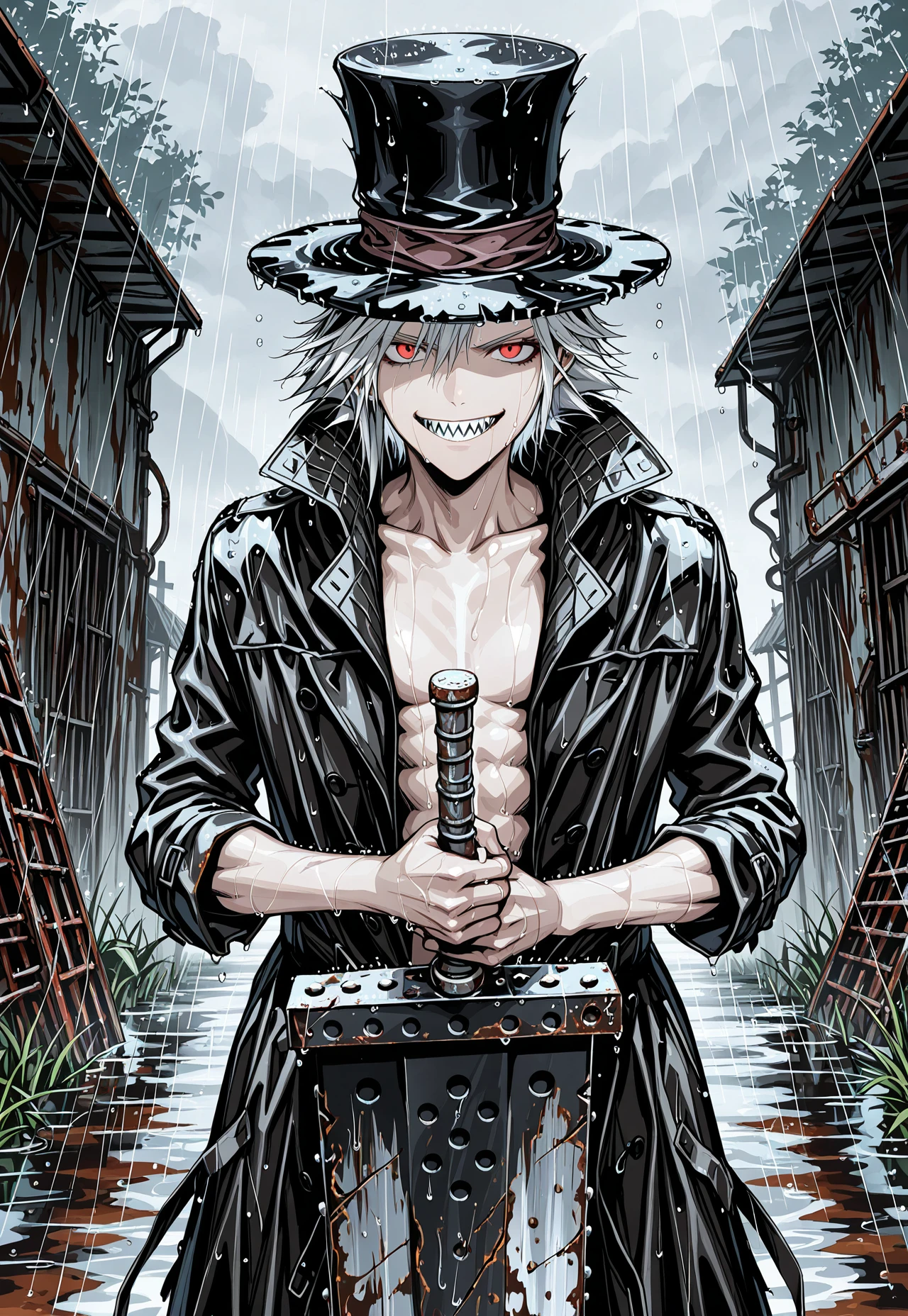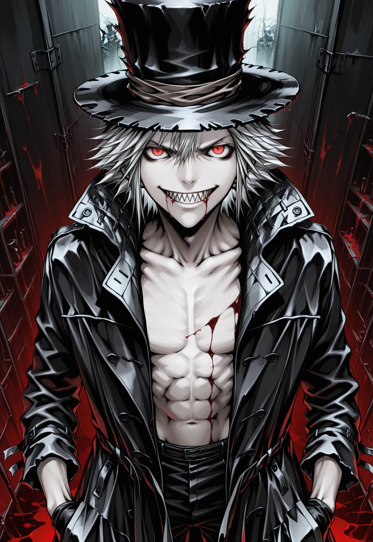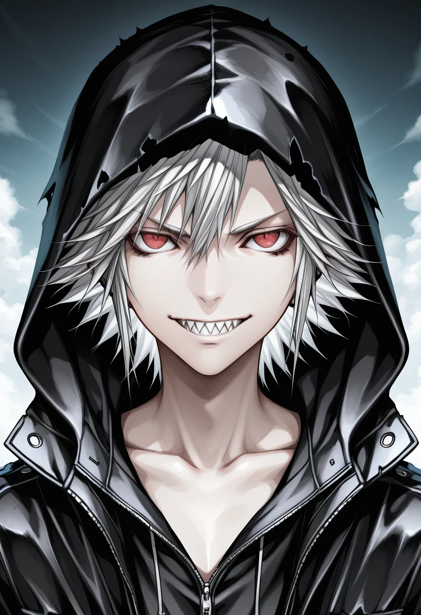 WHITE HAIR, RED EYES, SHARP TEETH,