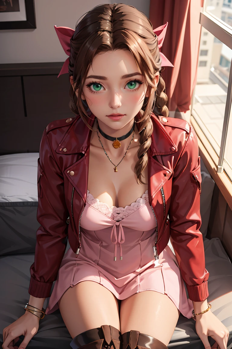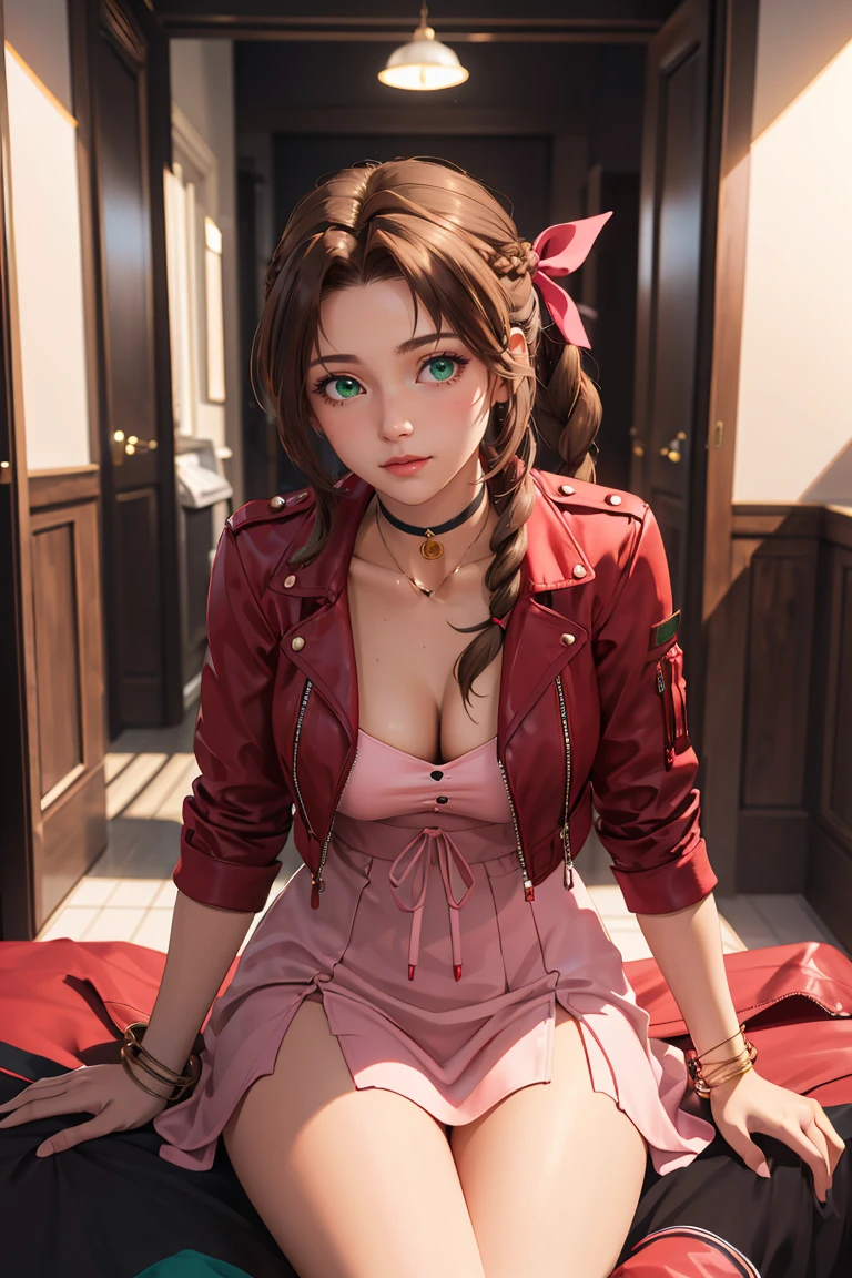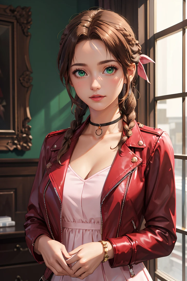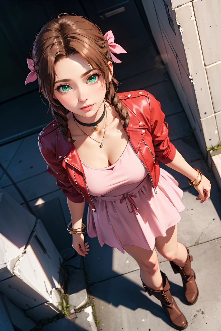 aerith gainsborough, choker, red cropped jacket, hair bow, bracelet, brown boots, brown hair, sidelocks, parted bangs, green eyes, braid, pink dress,