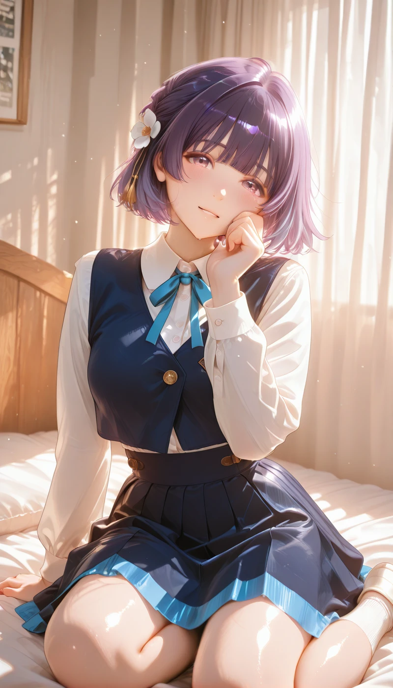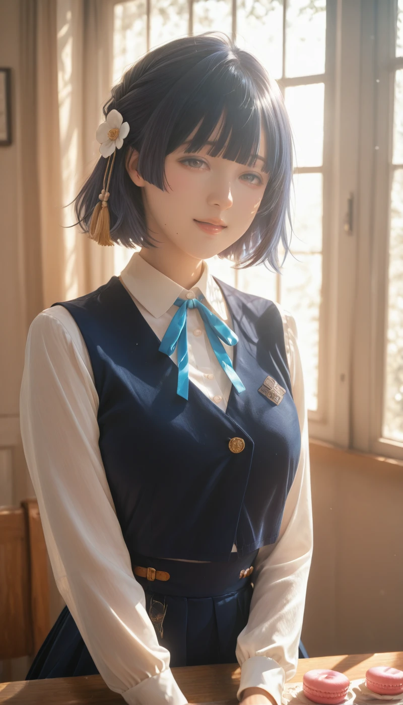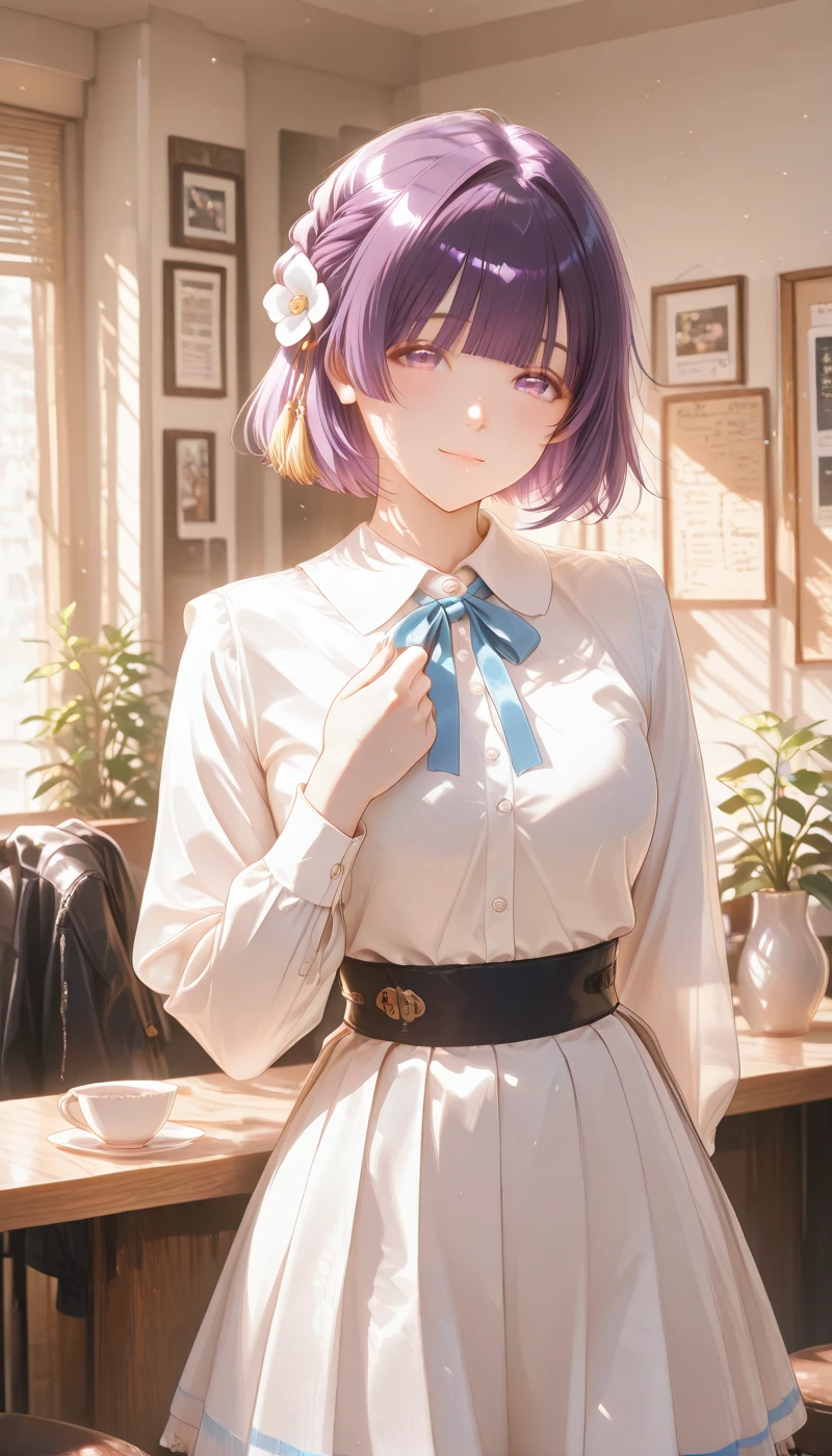 shirt, skirt, hair ornament, bow, ribbon, jewelry, white shirt, flower, short sleeves, collared shirt, black skirt, hair flower, bracelet, blue skirt, neck ribbon, dress shirt, buttons, blue bow, white flower, blue ribbon, tassel hair ornament, high-waist skirt, blue bowtie, shirt tucked in, thighs,
