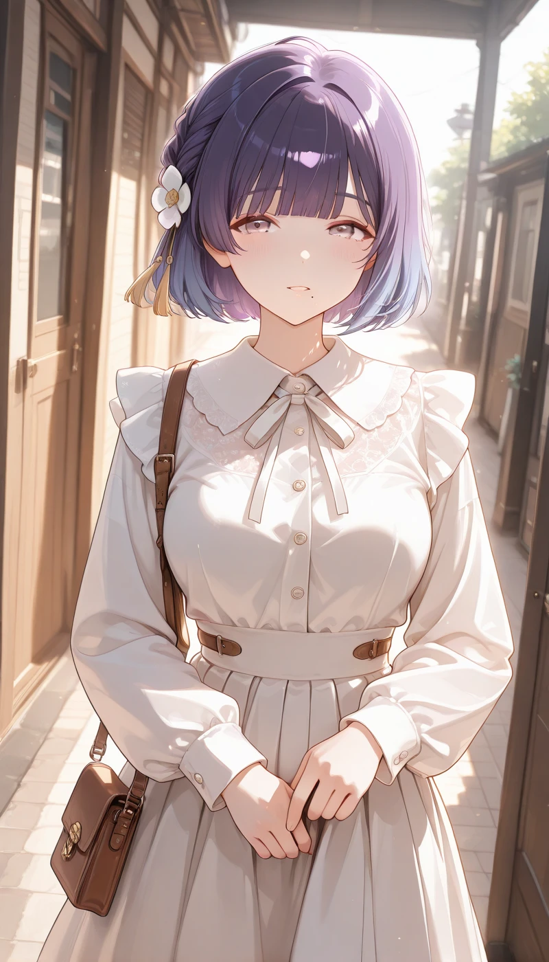 long sleeves, hair ornament, dress, bow, ribbon, flower, frills, hair flower, white dress, bag, neck ribbon, buttons, frilled dress, white flower, white bow, white ribbon, shoulder bag, handbag, collared dress, long dress, pleated dress, brown bag, white bag, tassel hair ornament,