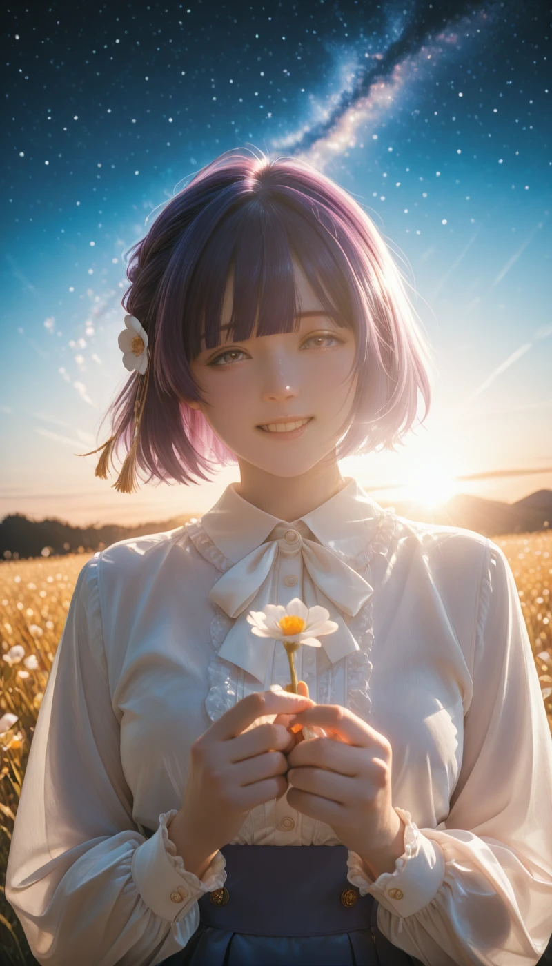 IMHataMisu, breasts, short hair, blue hair, purple eyes, braid, purple hair, blunt bangs, grey eyes, mole under eye, bob cut, mole under mouth, medium hair, medium breasts, multicolored hair, sidelocks, gradient eyes,