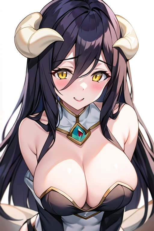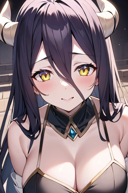 体征:long hair, black hair, hair between eyes, breasts, yellow eyes, large breasts,