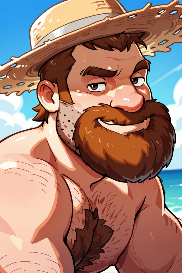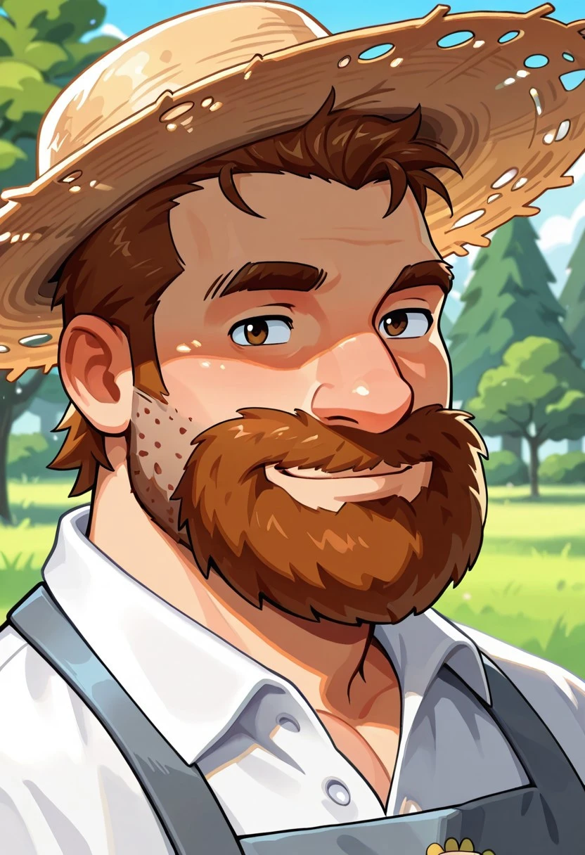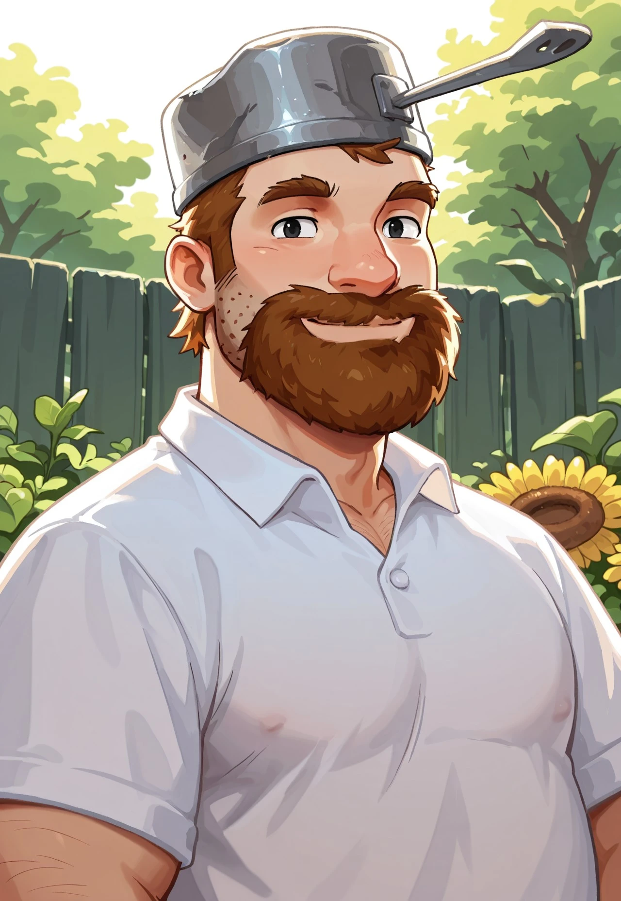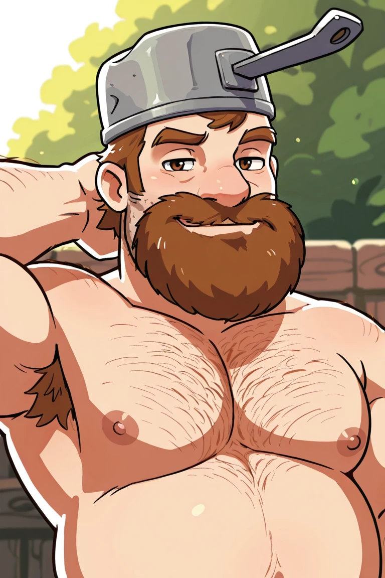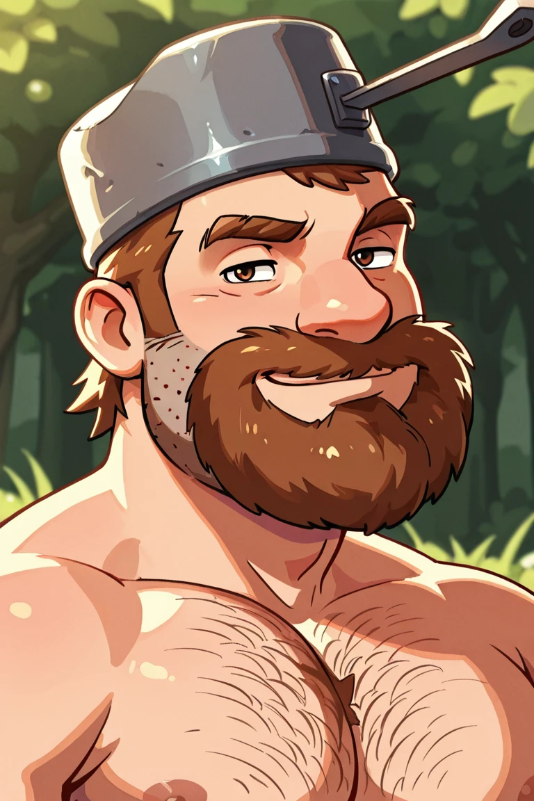 saucepan on head, brown hair, short hair, facial hair, beard
