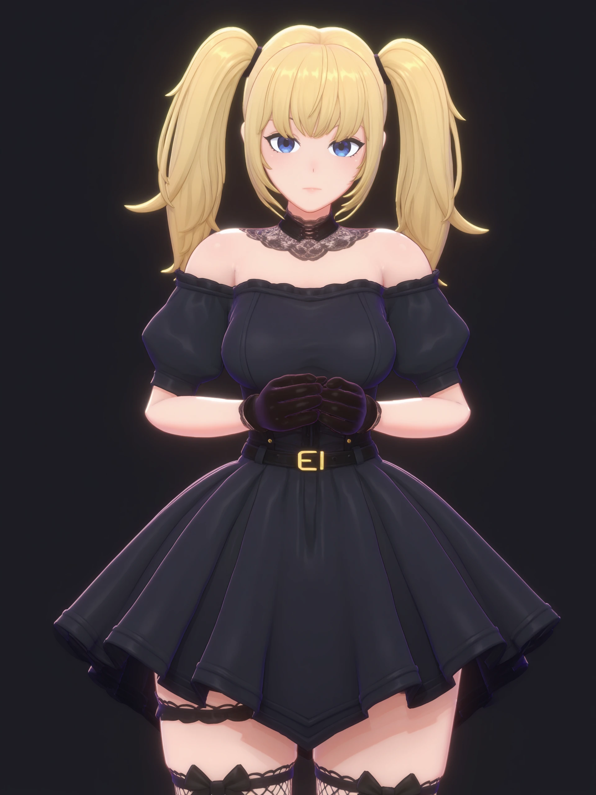 ani dress, black dress, bare shoulders, off shoulder, belt, puffy sleeves, gloves, thighhighs