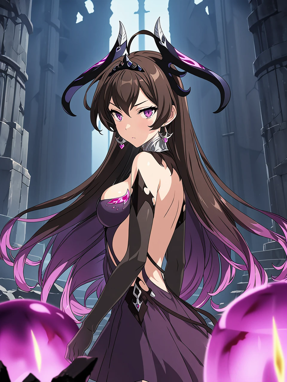 dsstene, purple eyes, black hair, purple hair, long hair, bangs, medium breasts, ahoge, tiara, horns, dress, elbow gloves, cleavage, bare shoulders, clothing cutout