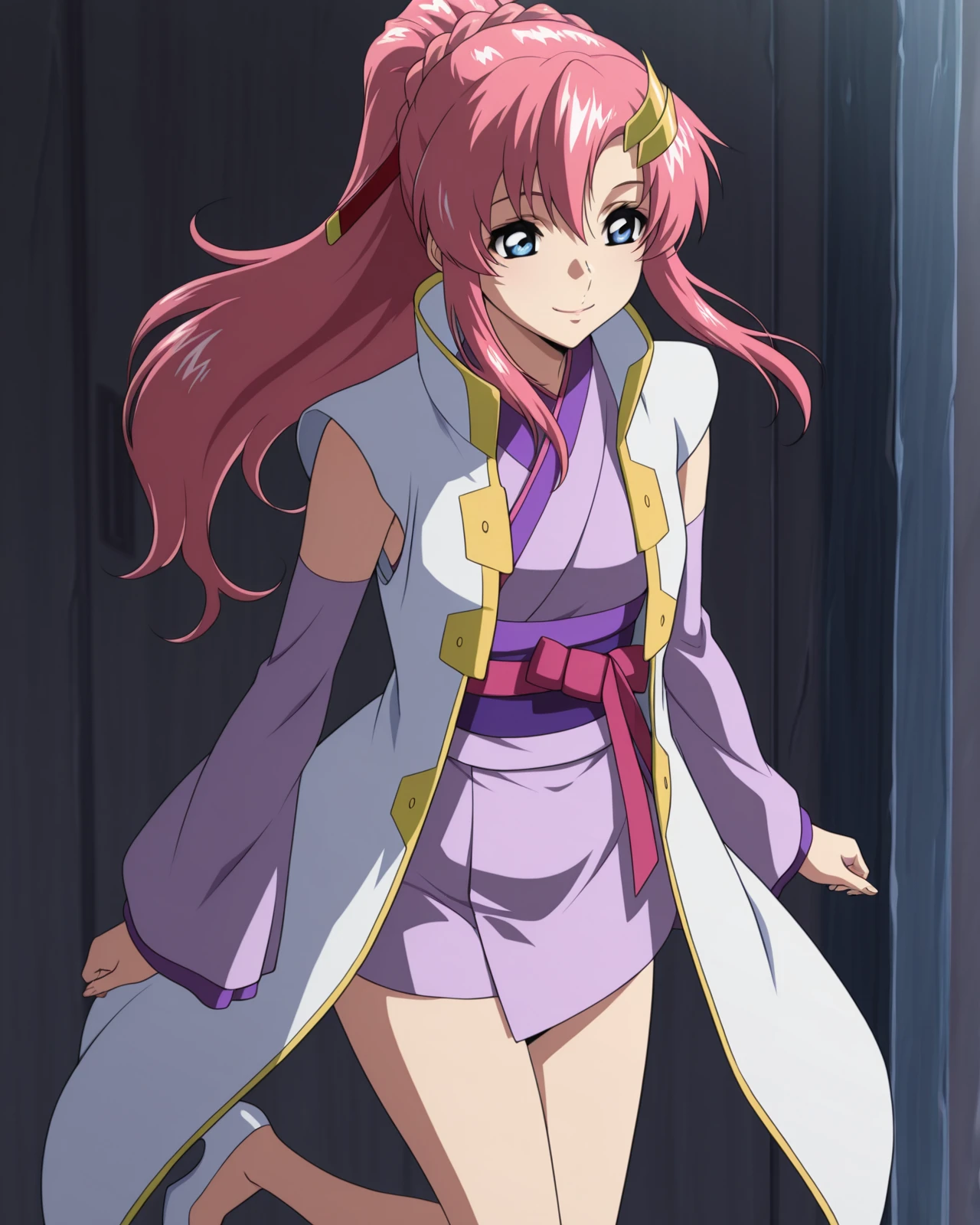 long hair, high ponytail, pink hair, hair ornament, hair ribbon, hair between eyes, purple eyes, lipstick, black sleeveless kimono, sash, black thighhighs
