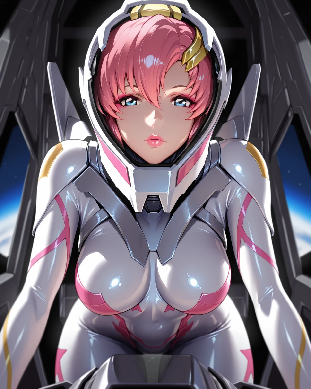 short hair, bodysuit, leaning forward, helmet, robot, bent over, lipstick, mecha, skintight, science fiction, pilot suit, white bodysuit, spacesuit, cockpit, pilot
