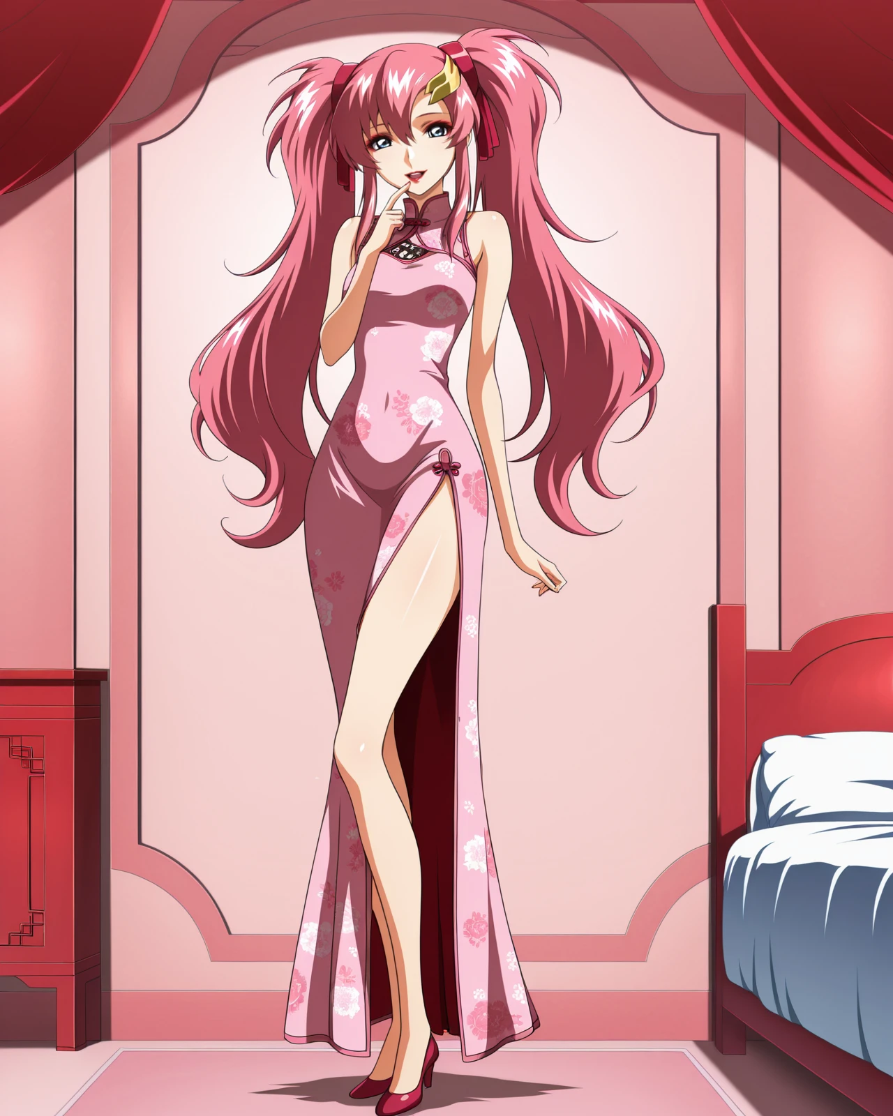 hair ornament, dress, hair between eyes, bare shoulders, very long hair, twintails, pink hair, sleeveless, high heels, legs, sleeveless dress, makeup, chinese clothes, floral print, red footwear, lipstick, pink dress, china dress, side slit, long dress, pink footwear, red lips, print dress, pumps