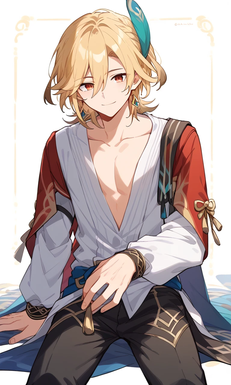 Trigger words: kaveh,blonde hair,hair between eyes,red eyes,shirt,jewelry,earrings,hair ornament,feathers ,feather hair ornament,long sleeves