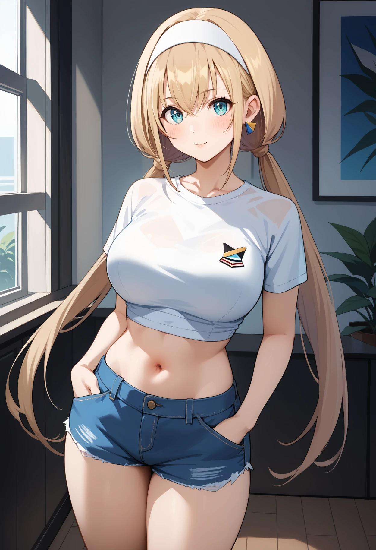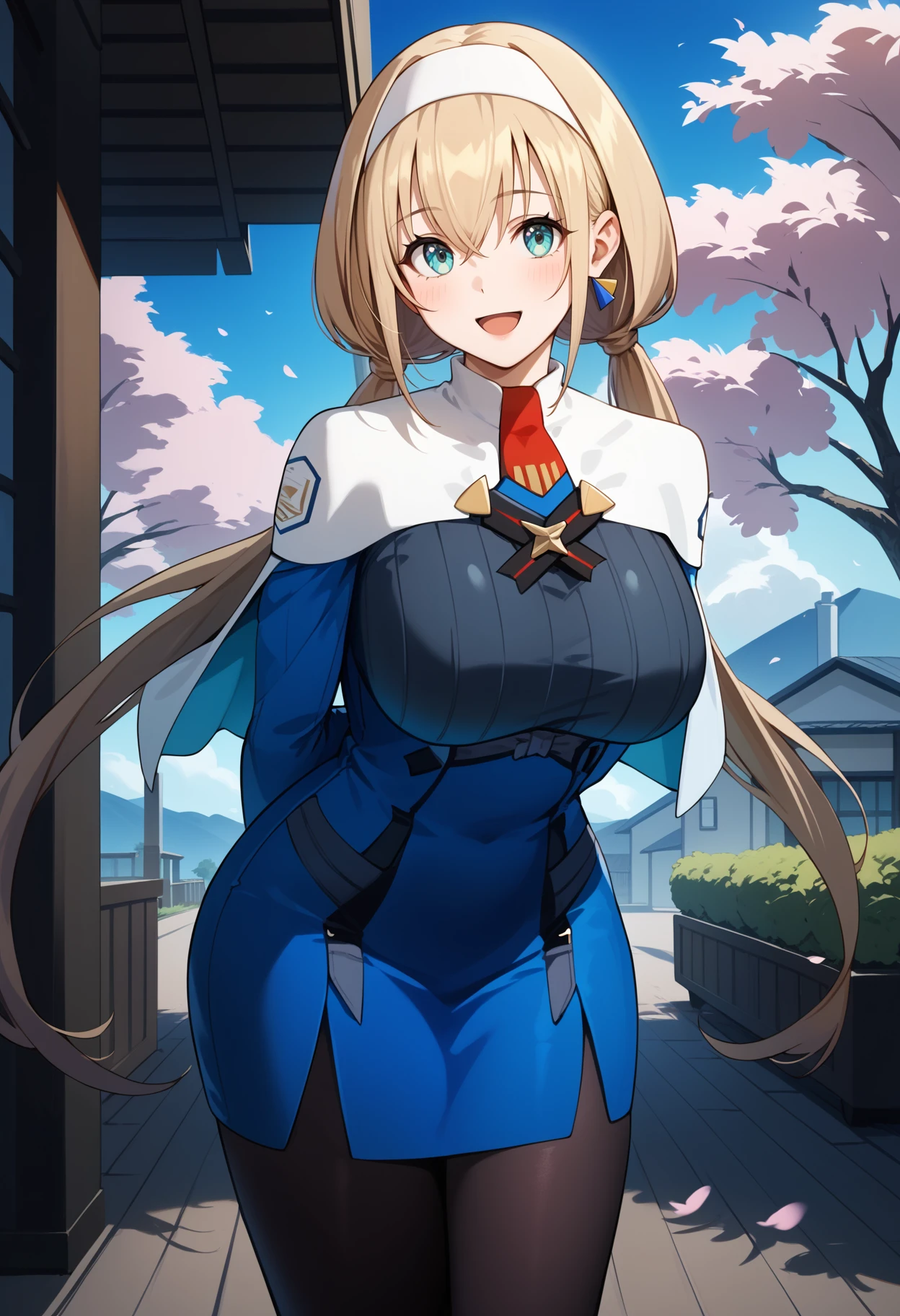 outfit11girl, solo, long hair, blonde hair, low twintails, white hairband, triangle earrings, large breasts, military uniform, white capelet, necktie, blue dress, long sleeves, black pantyhose