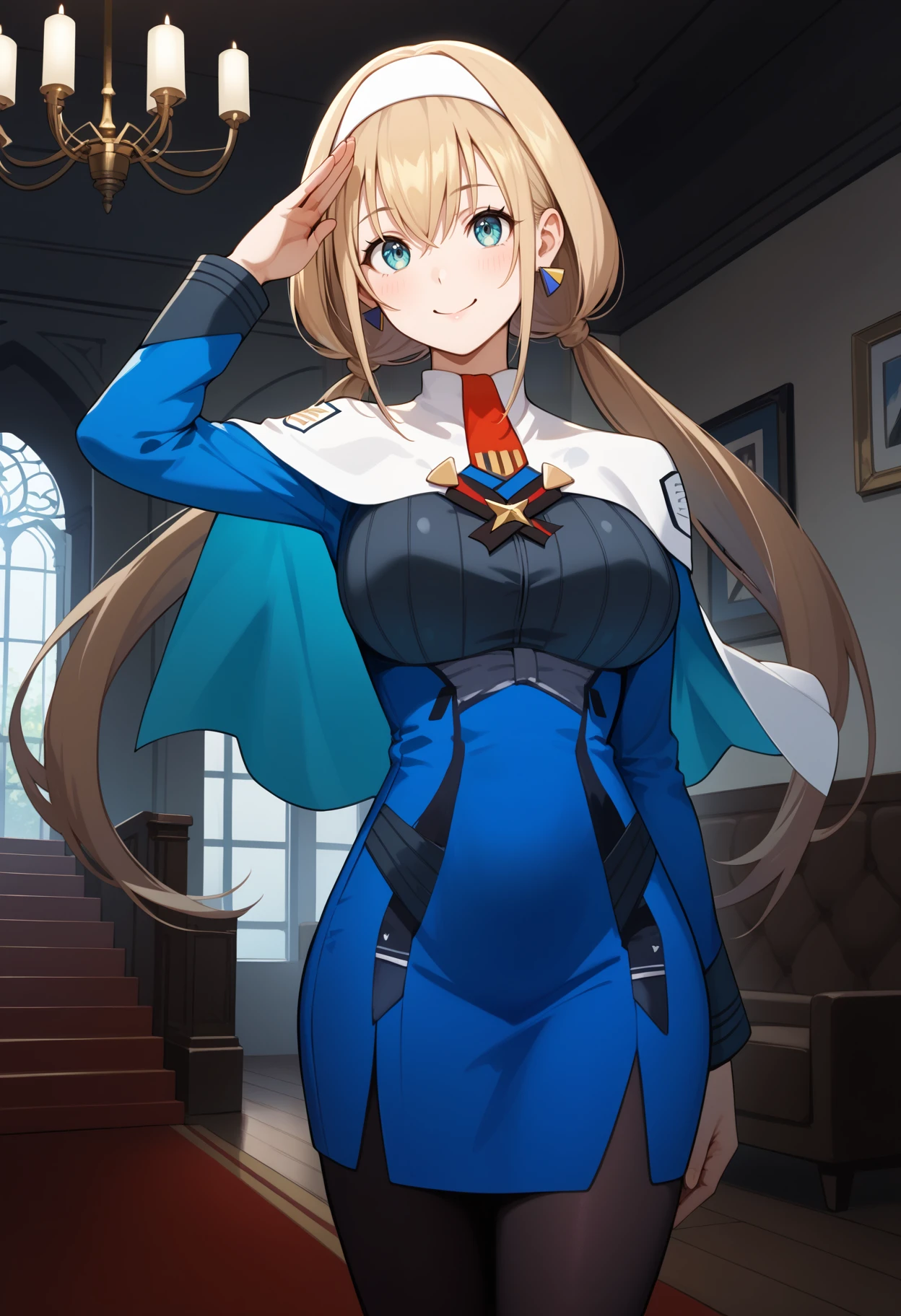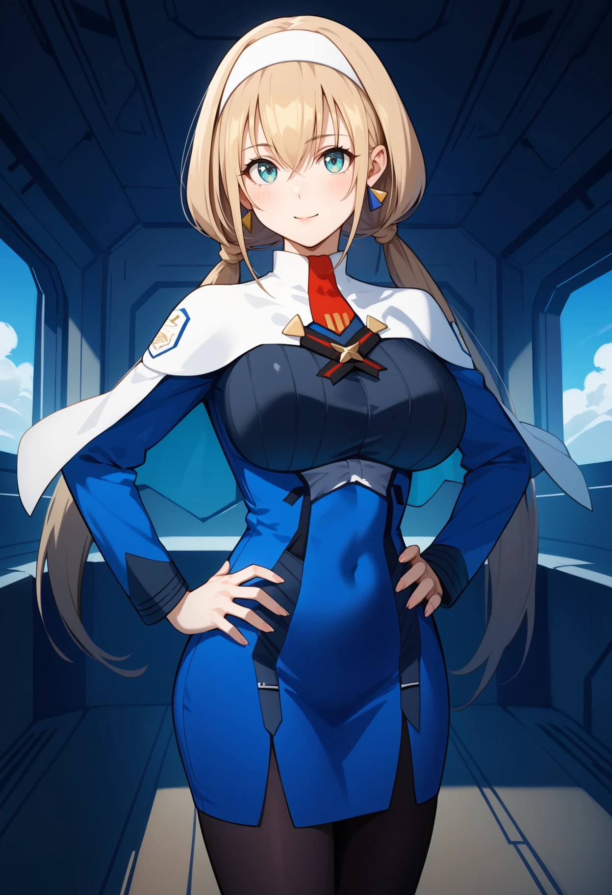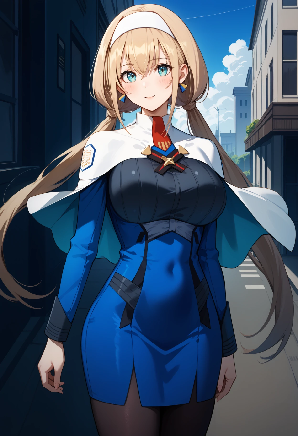 1girl, solo, long hair, blonde hair, low twintails, white hairband, triangle earrings, large breasts, military uniform, white capelet, necktie, blue dress, long sleeves, black pantyhose